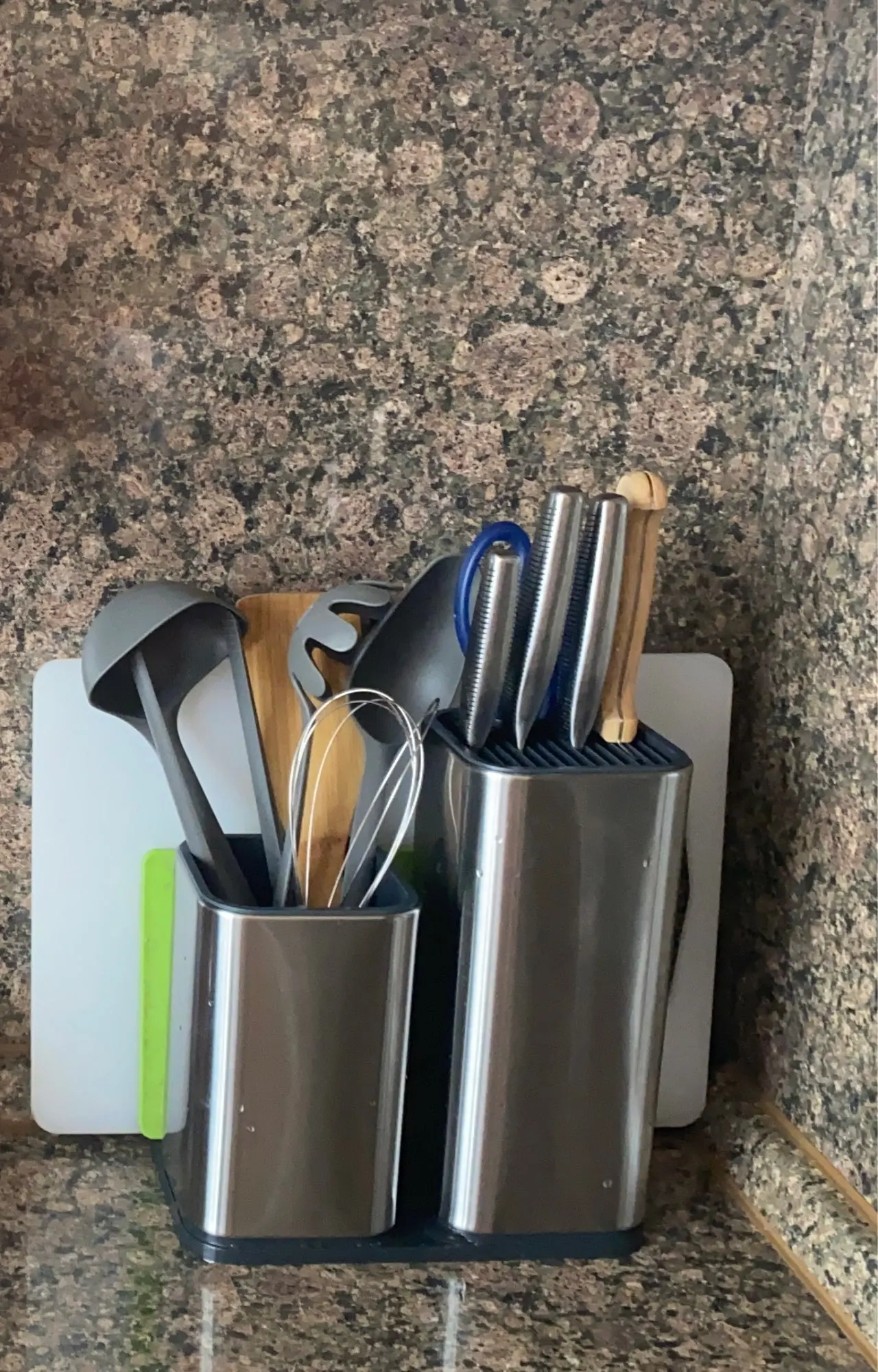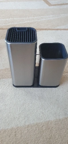 Подставка выполнена аккуратно, хорошо смотрится, ножи удобно вставлять. Мне неудобно, что емкости приклеены к поддону. За поверхностью емкостей легко ухаживать, капли воды или отпечатки легко удаляются мягкой тканью. Заказ пришел быстро. Все надежно упаковано. Продавца рекомендую.