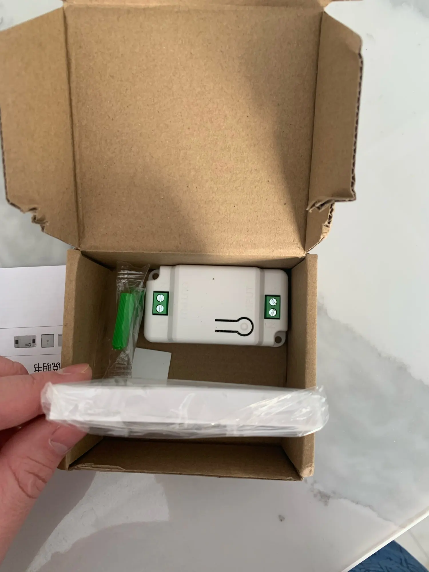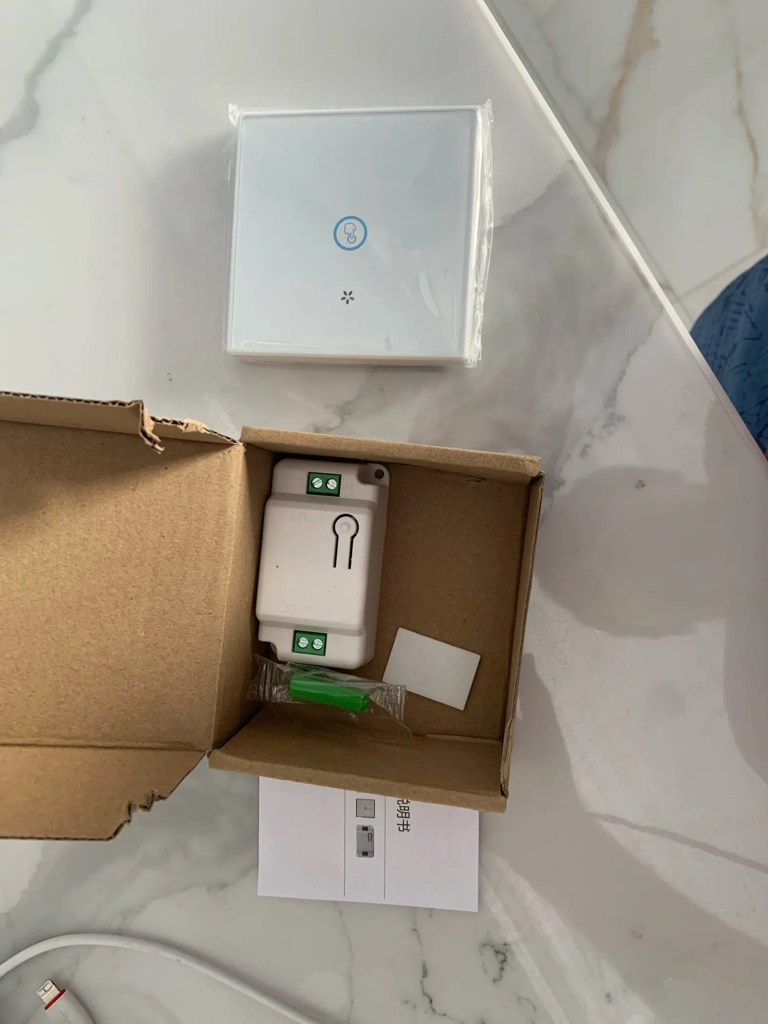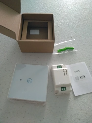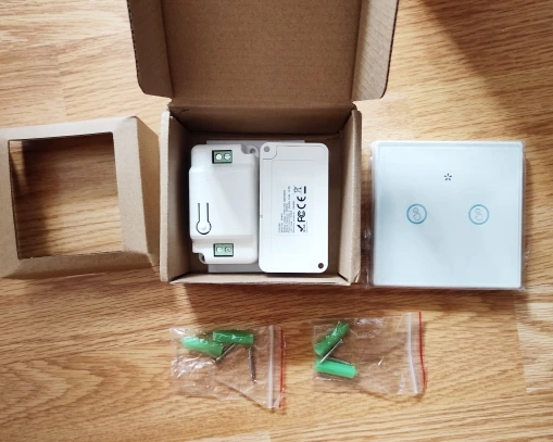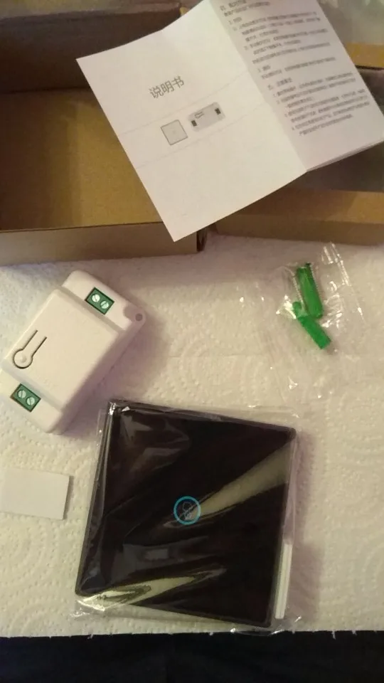Посылка шла 20 дней. Выключатель был отлично упакован: маленькая картонная коробка была обернута в пупырку и сам пакет был с пупыркой. Посылка состоит из выключателя, контроллера, комплекта крепежа, инструкции и двух наклеек.
