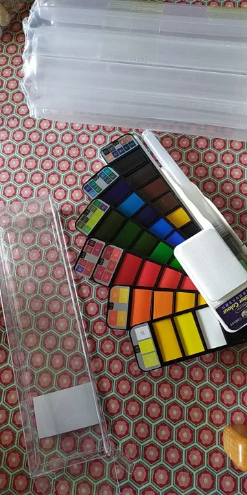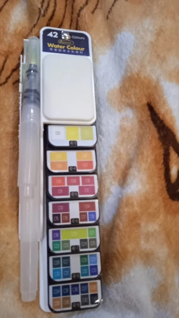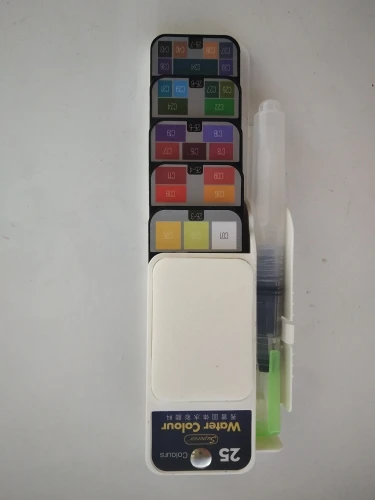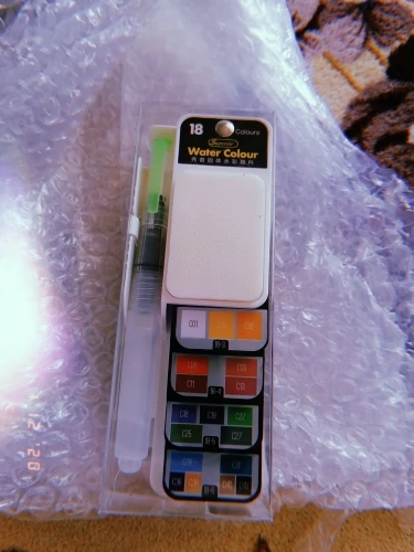 Доставка в Мск 25 дней. Упаковка отличная для почты России). Краски отличные, цвета сочные, высокопигментированные. Конечно кюветочки тонкие, но как дорожный вариант очень недурно и очень удобно, т.к. занимают мало места. Не на один отпуск хватит в дорогу. Водяная кисточка в комплекте. Рекомендую. Вещь