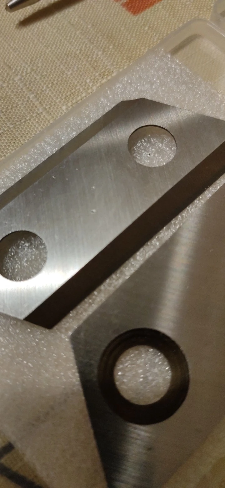 Ножи выглядят качественными. В сравнении с теми, что стоят на моем Патриоте, немного отличаются геометрией. Хорошо видно на второй фотографии. Не думаю, что это критично. Опробовать в деле получится только весной. Если вы захотите качественно точить эти ножи, то они точатся на специализированных станках, для плоских ножей (ищите деревообрабатывающие предприятия). Либо нужно делать приспособления для самостоятельной заточки (не каждый сможет)