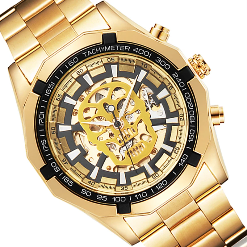 Роскошные автоматические механические мужские часы-скелетоны с золотым черепом, наручные часы из нержавеющей стали с автоподзаводом, мужские большие часы, мужские часы