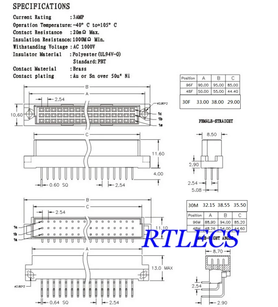 5Pcs DIN 41612 Connector 3 Rows 30 Pin Din Female Sockets Receptacle Vertical Through Hole 3x10 30 Pin Pitch 2.54mm