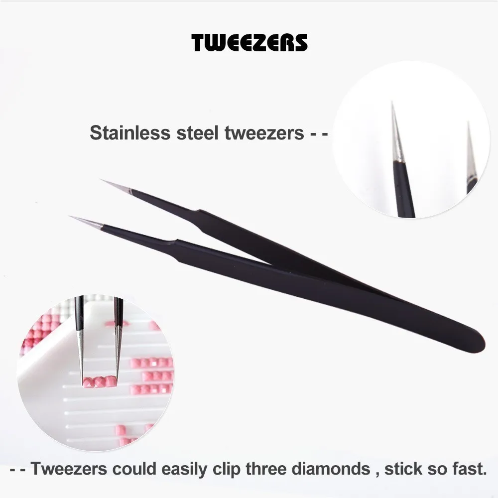 Инструменты включают в себя: алмазную пластину, клей, пинцет, ручки (наклеить 10 бриллиантов одновременно)