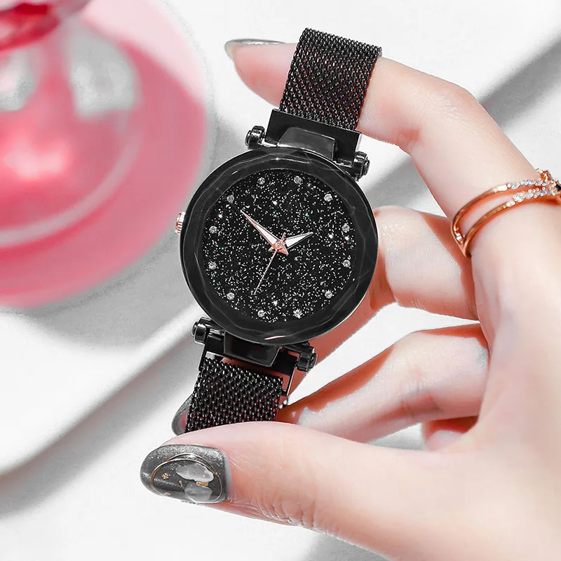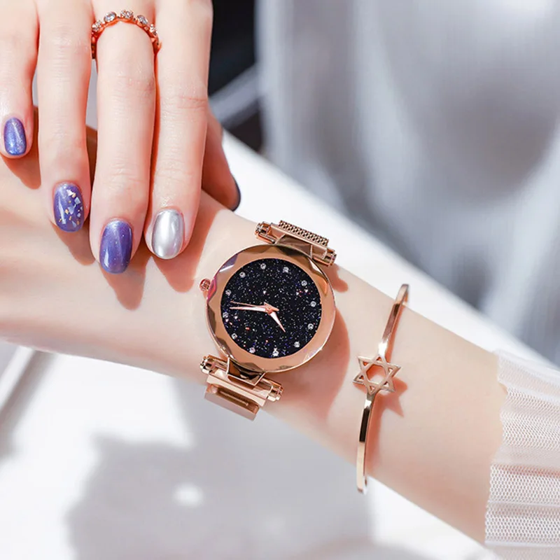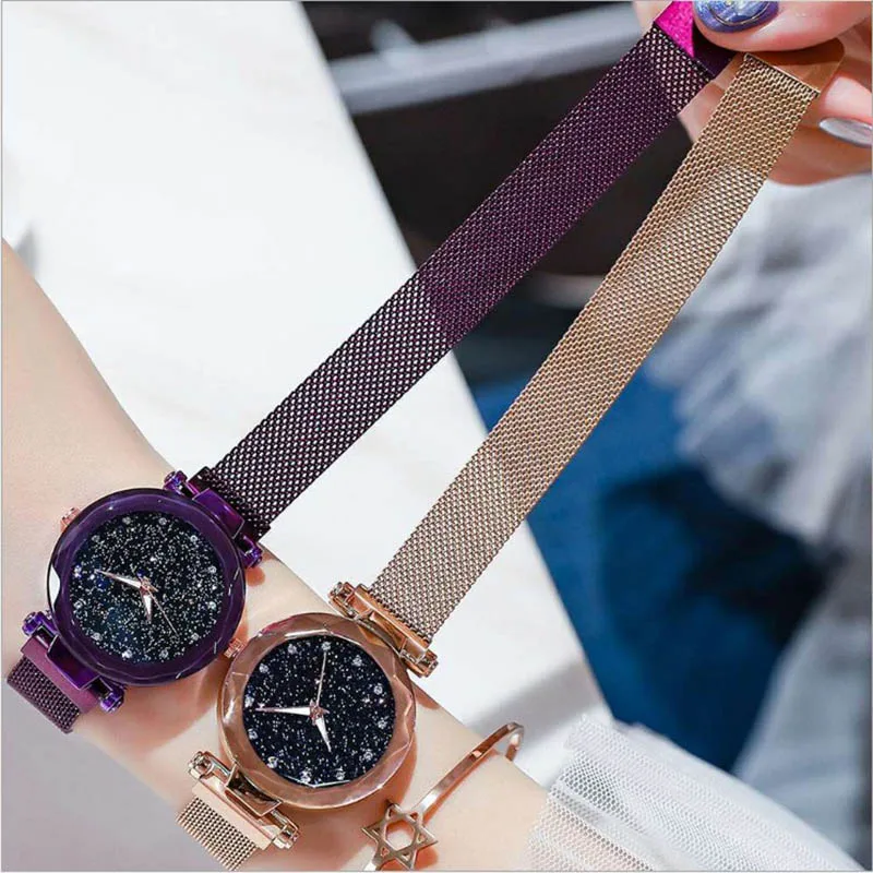 Роскошные часы Starry Sky женские, кварцевые, с магнитной сеткой, цвета розового золота, фиолетовые, Классические, модные, со стразами, водонепроницаемые, подарок