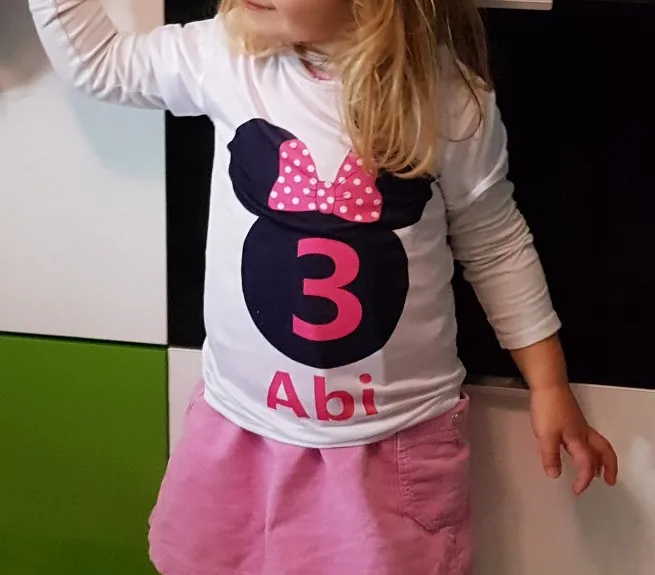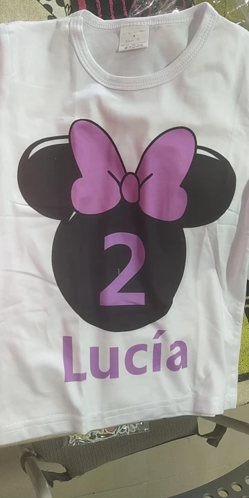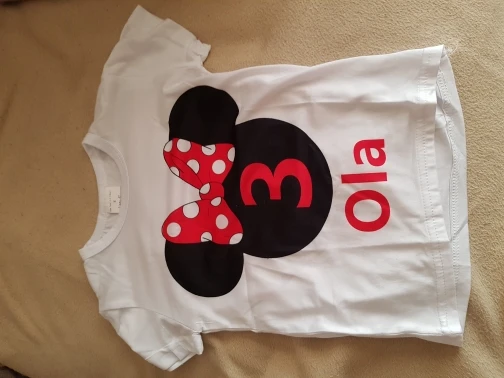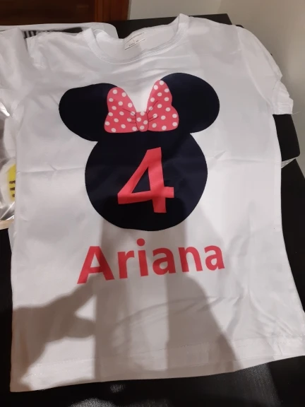 Очень красивая футболка. Он был настроен по запросу. Материал немного искусственный, но это не неудобно-по крайней мере, это то, что говорит ребенок. Проблема только в том, что наш товар немного грязный (размачивайте на стороне головы Минни; Его можно увидеть на фото с увеличением), но мы надеемся, что он будет чистым в цикле стирки.