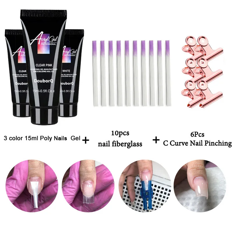Посылка включает в себя: 3 цвета полигель для ногтей + 10 шт. стекловолокно для ногтей + 6 шт. зажимы для ногтей