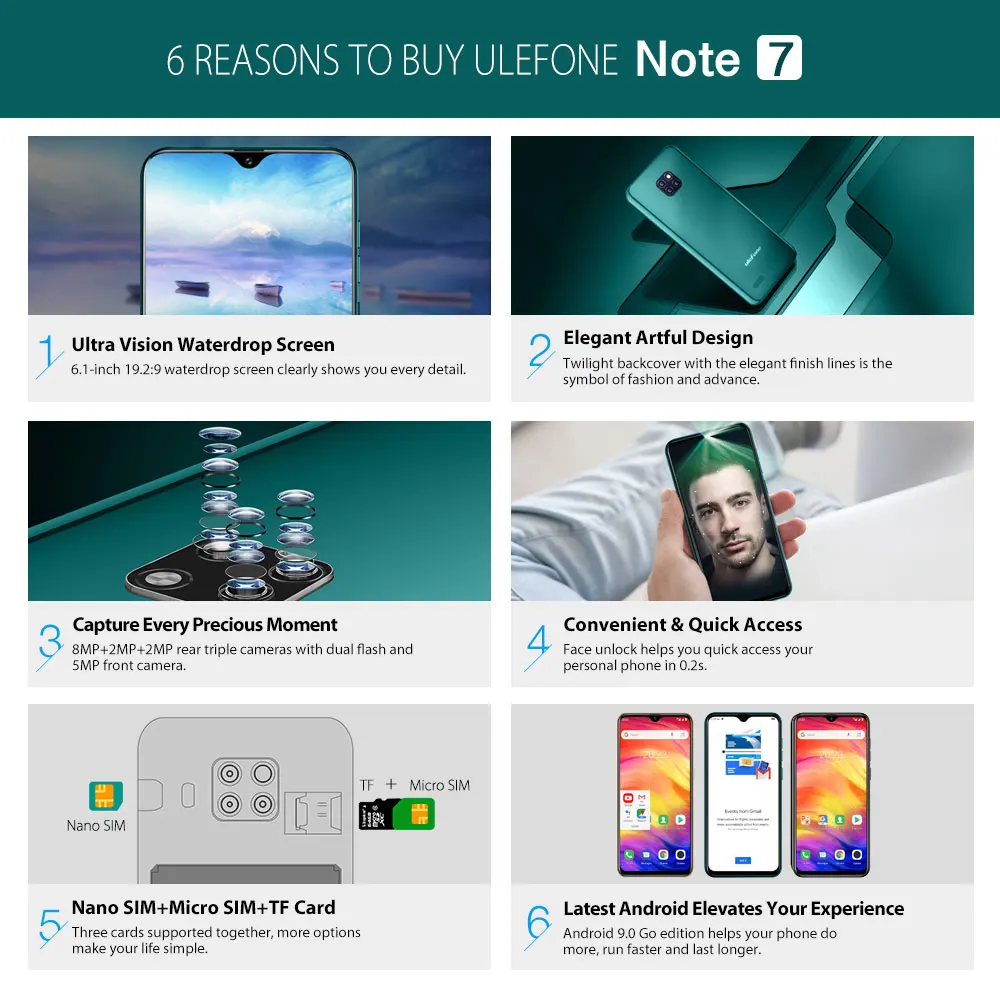 Ulefone Note 7 смартфон 3500 мАч 19:9 четырехъядерный 6,1 Waterdrop экран 16 Гб ROM мобильный телефон Android 10,0