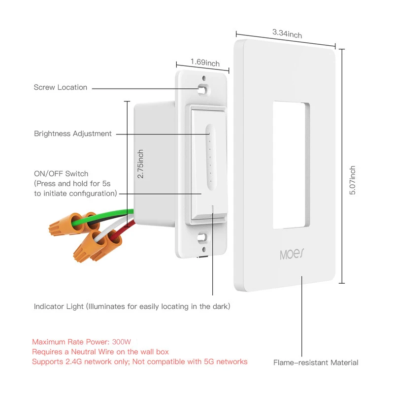 5.★Примечание: умный диммер MOES требует подключения к нейтральному белому проводу для правильной работы/Максимальная мощность: 400 Вт лампа накаливания, 150 ваттов CFL или светодиодный/однополярный только (не 3-сторонний выход)/2,4G Wi-Fi только/подходят к любому Стандартный настенная панель переключателя.