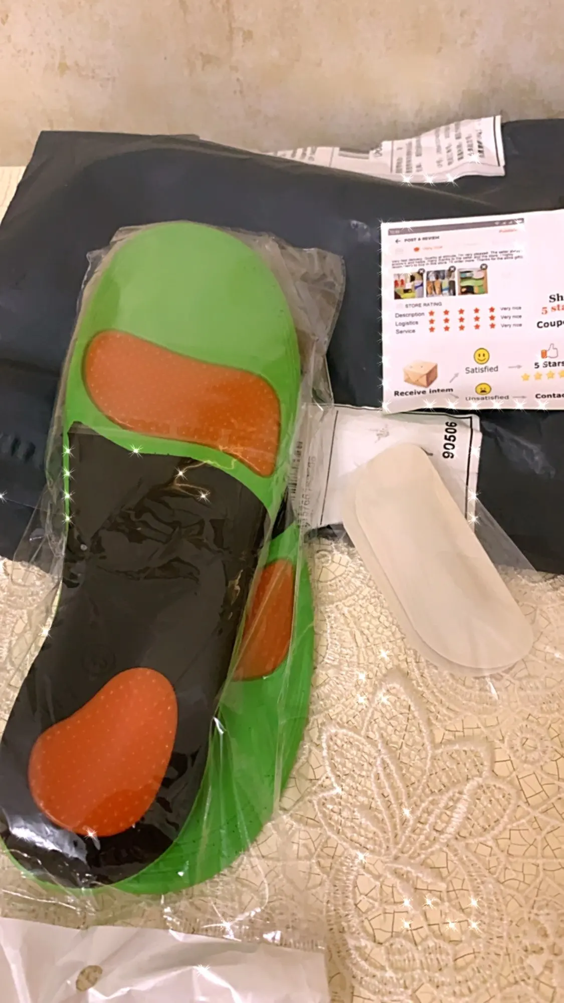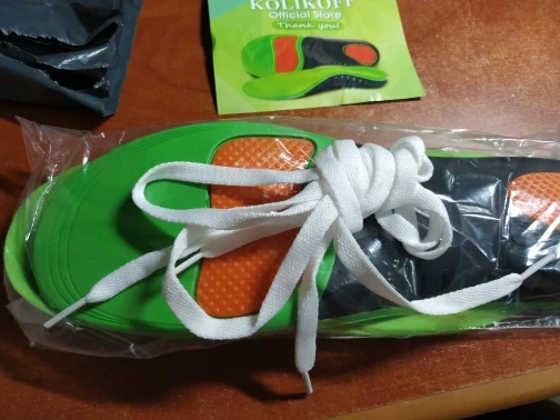 Очень хорошие стельки. С продавцом общалась, просила маленький размер. Откликнулся сразу и действительно прислали то, что нужно, ещё и подарочек положили. Не открывала, но думаю, что это фиксаторы для ступни в летние сандали. Молодцы! Посылка пришла за 3 недели, вероятно собирали все заказы в одну ( на первом фото видно сколько их). Я очень довольна заказом. Подобные ортопедические стельки покупаю за 1000 $. Посмотрим как будут служить. Есть совсем небольшой запах. Продавца советую, порядочный и честный. Огромное спасибо вам.
