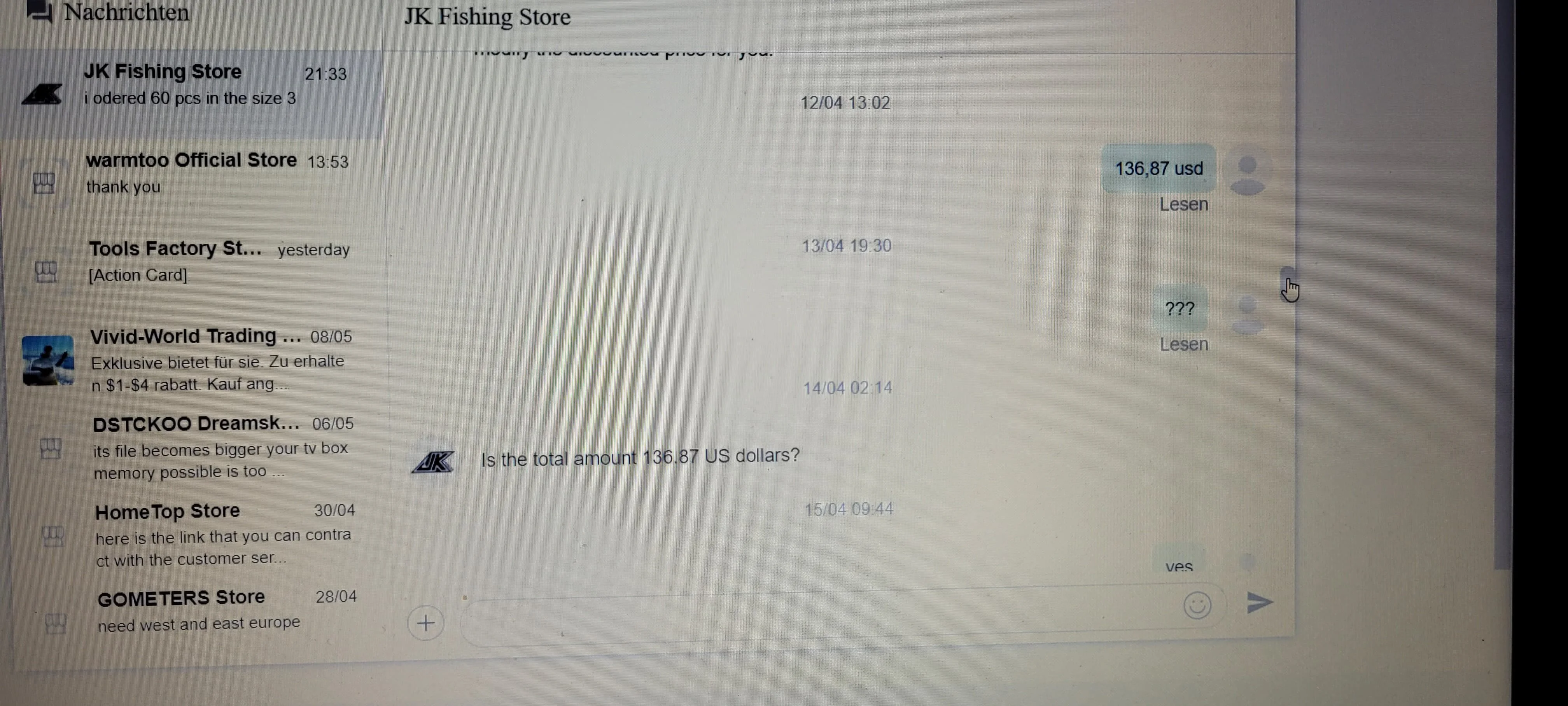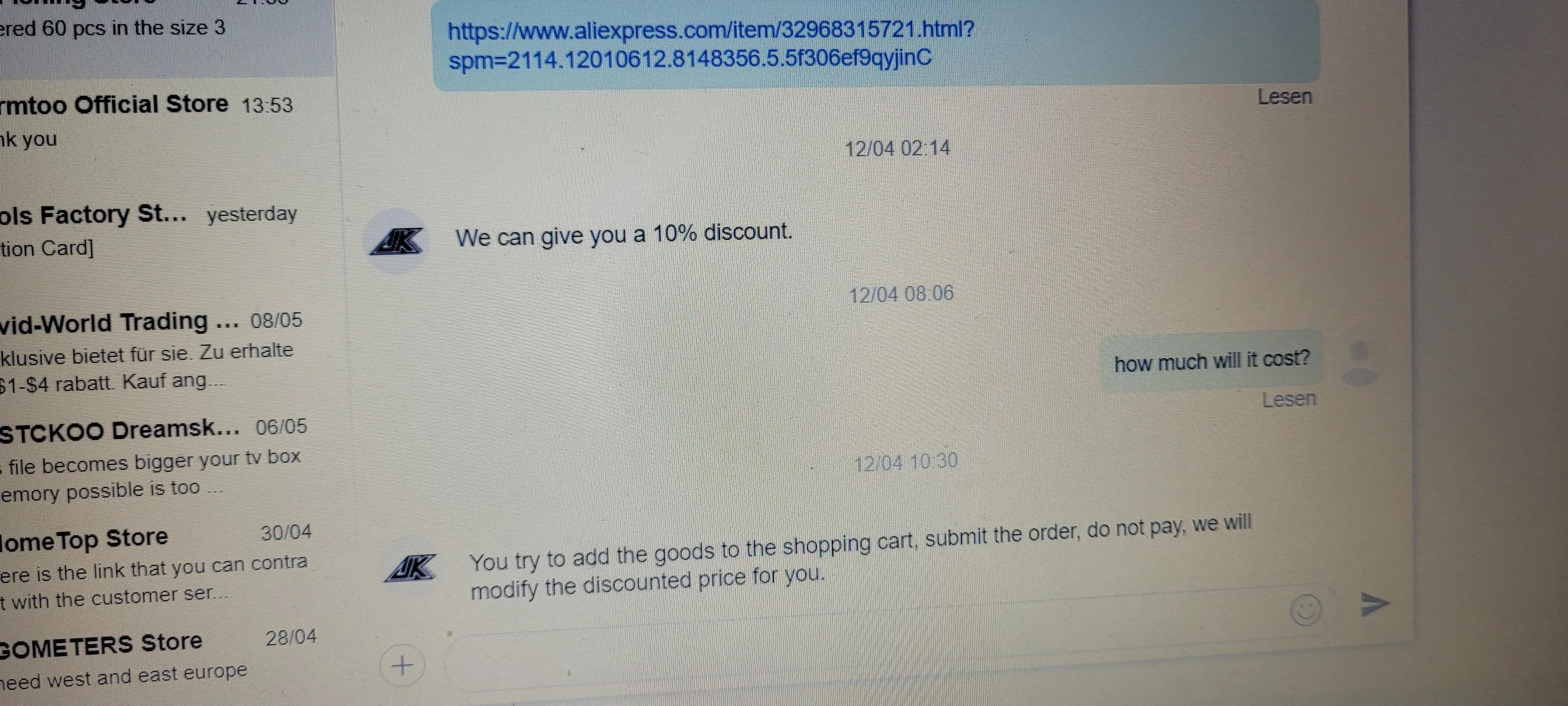 Я заказал больше вещей у этого продавца, после согласования общей суммы, которую я заплатил по договоренности. После оплаты общей суммы, я получил уведомление от AliExpress о том, что две упаковки из 30 крючков для джиггинга для соленой воды SJF39 больше недоступны. Я связался с продавцом, чтобы отправить мне все оплаченные товары вместе, как только он имеет 2 упаковки из 30 крючков для джигггинга в соленой воде SJF39 снова в наличии. Но он не отправил все, что я заказал и за что заплатил.