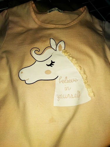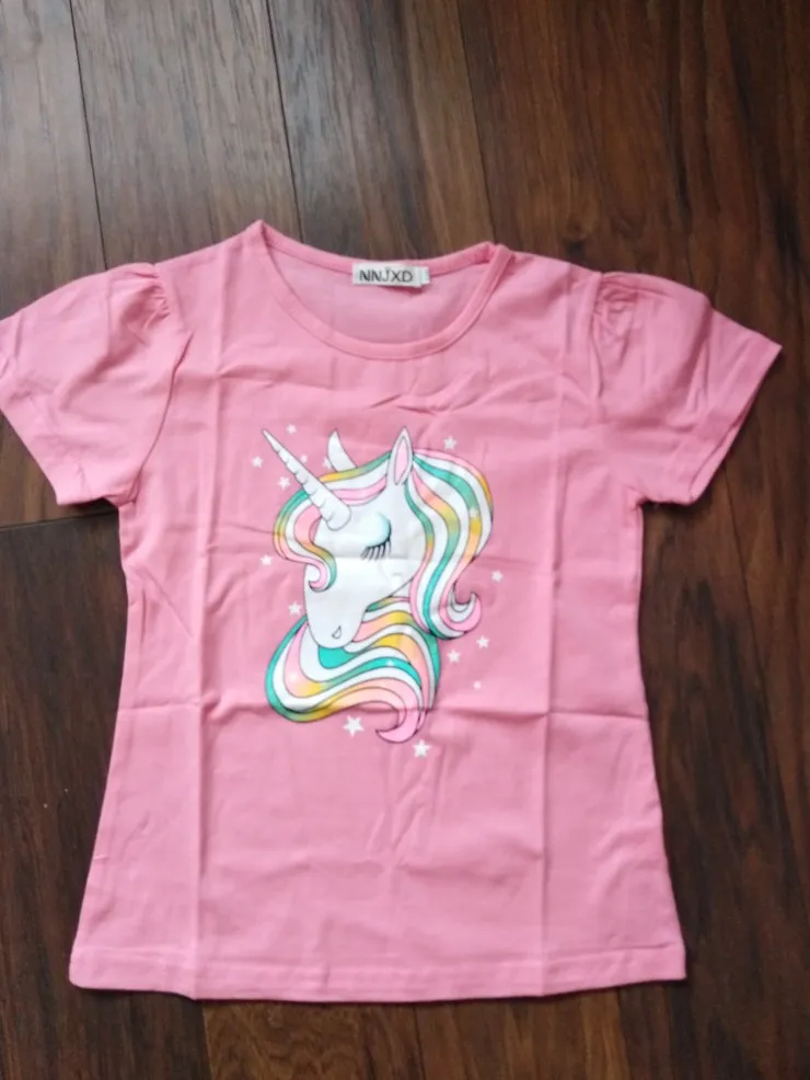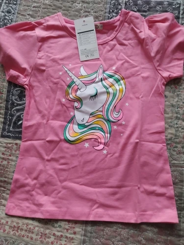 футболка х/б чистый, цвет не розовый, ближе к оранжевому, но не яркий, приятный, размер 8 написано 140, на наш 125-130 будет норм думаю, может и 140 подойдёт, не мерила, не знаю...потом дополню....блёстки как поведут себя после стирки тоже не знаю... но смотрятся здорово, грива пришита, вообщем мне понравилась и по качеству и рисунок ... если будет носится тогда вообще класс, рекомендую