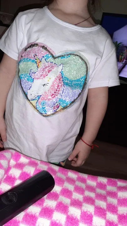 очень быстро 2 недели до МО. все как на фото. размер указан 120, но моя дочь 110 эта футболка оказалась великовата. на фото рядом с другой аналогичного размера. пайетки имеют двусторонний рисунок.