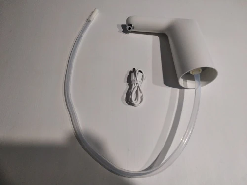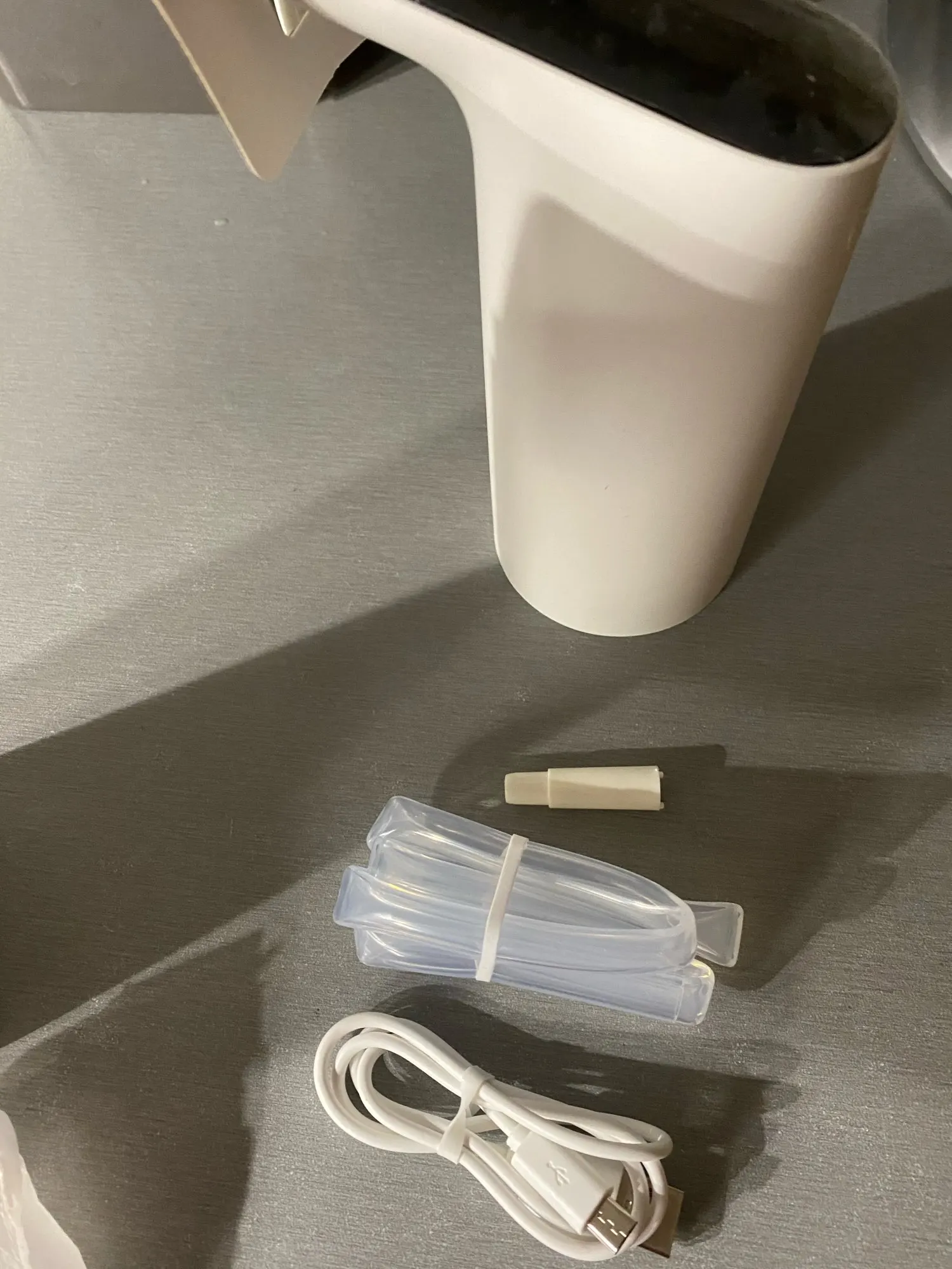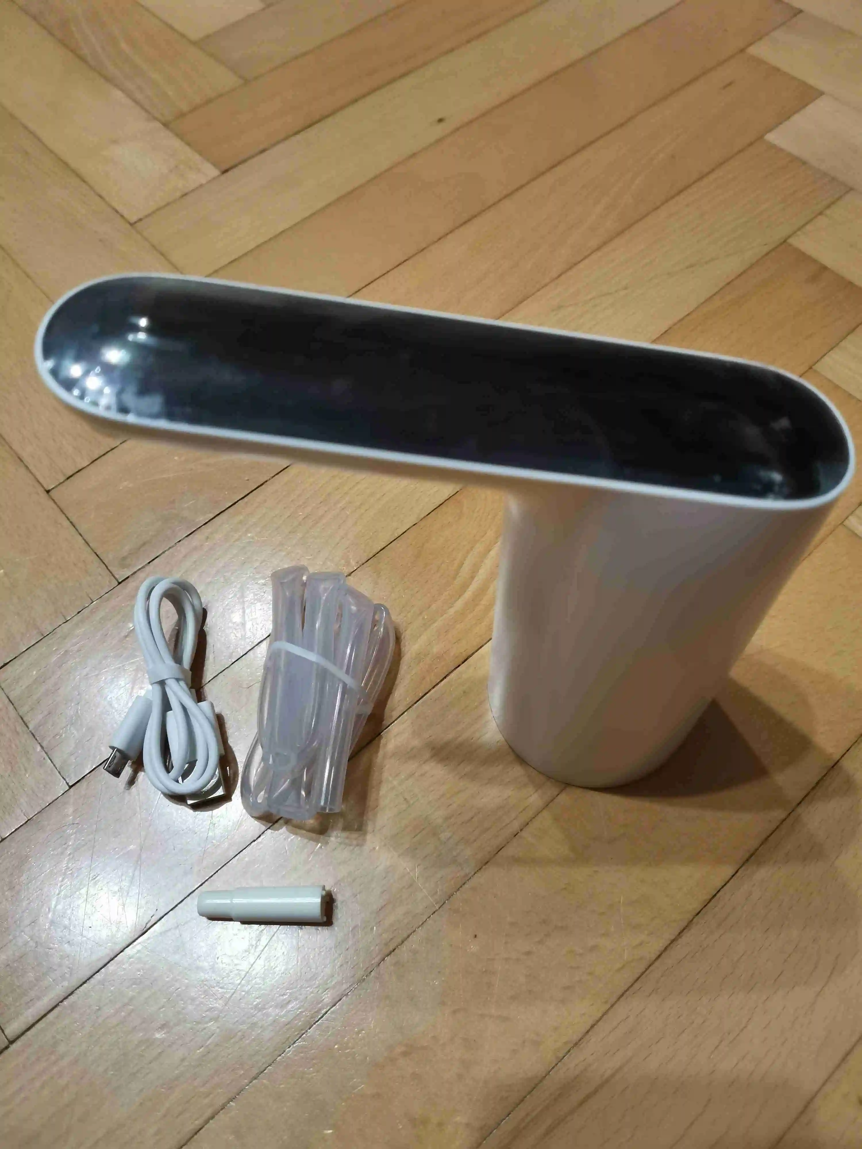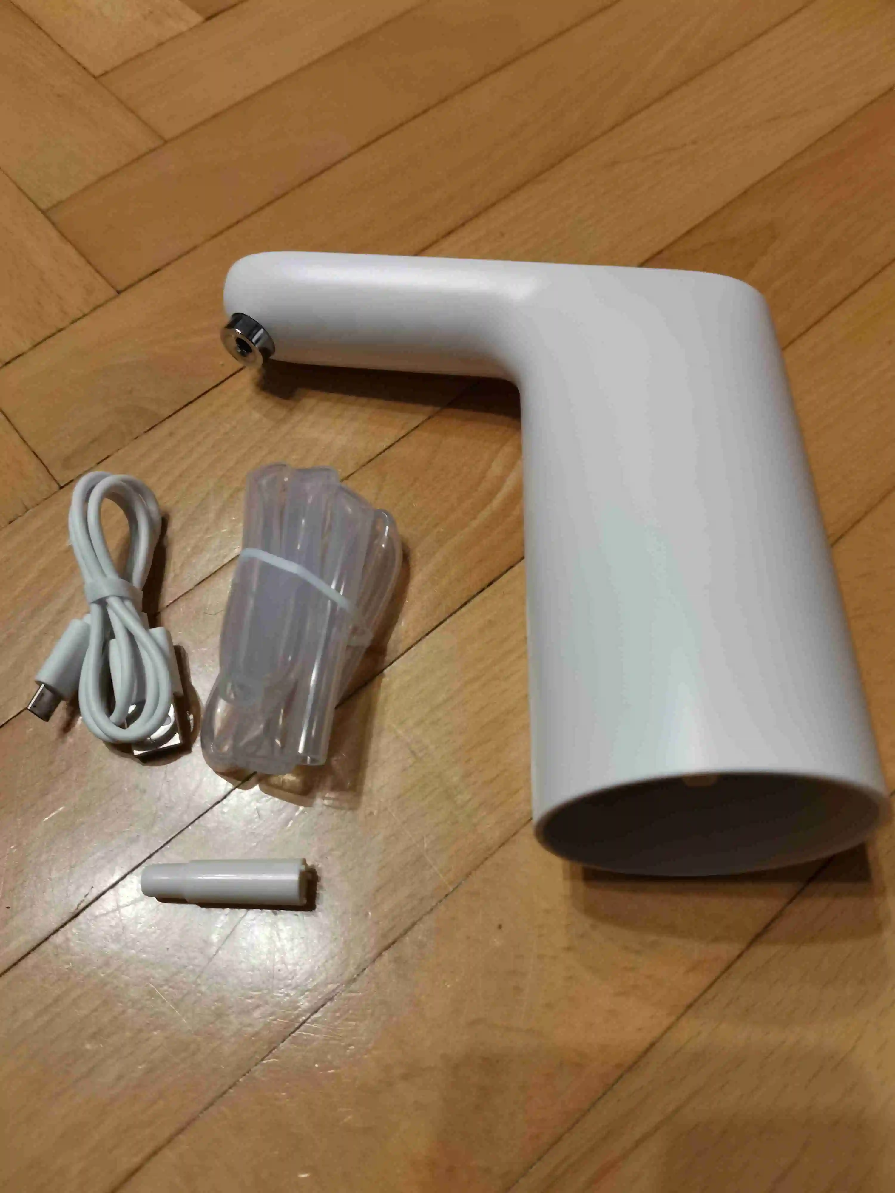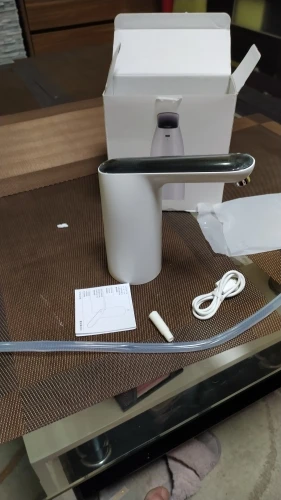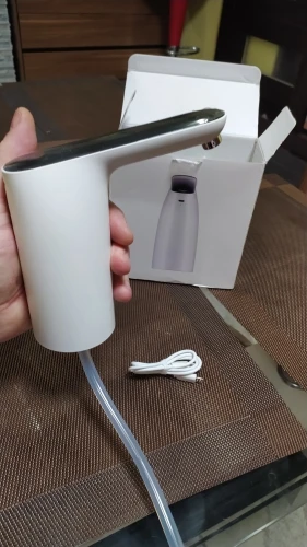 Товар доставлялся больше 2 месяцев. Описанию соответствует, выглядит не плохо. В комплекте идёт гибкая прозрачная трубка с наконечником и небольшой кабель для подзарядки микро-USB. Если с бутылки уже снята полиэтиленовая пробка, то можно просто поставить помпу сверху, но она будет болтаться. А если продавить отверстие в пробке и поставить помпу прямо на пробку, то она плотно садится. Кнопку брал механическую, есть вариант сенсорной, срабатывает хорошо, вода останавливается сразу и не подтекает, как на механических помпах.