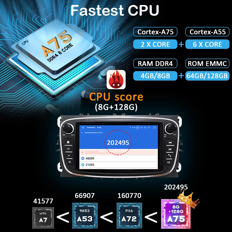 PX6PX6 является лучшим чипом на рынке в настоящее время, он работает быстрее, чем все другие типы. Балл ANTUTU составляет 160770, что лучше 7853 4G + 64G, PX5 и всех других типов 4 + 64G на рынке. По сравнению с другими радио типа fo, PX6 radio может загружать больше видов приложений android с android market, и приложение может работать лучше.