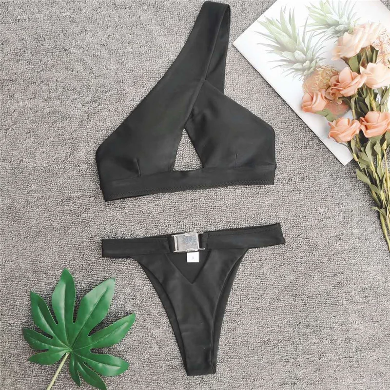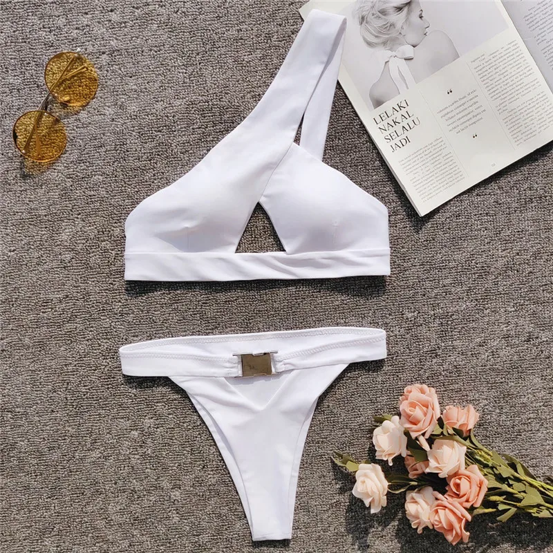 Бикини на одно плечо, 2021, с застежкой, с высоким вырезом, белый, с пуш-ап, женский купальный костюм, сексуальные стринги, бикини
