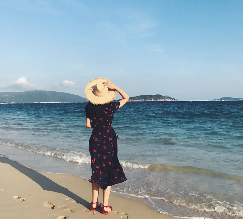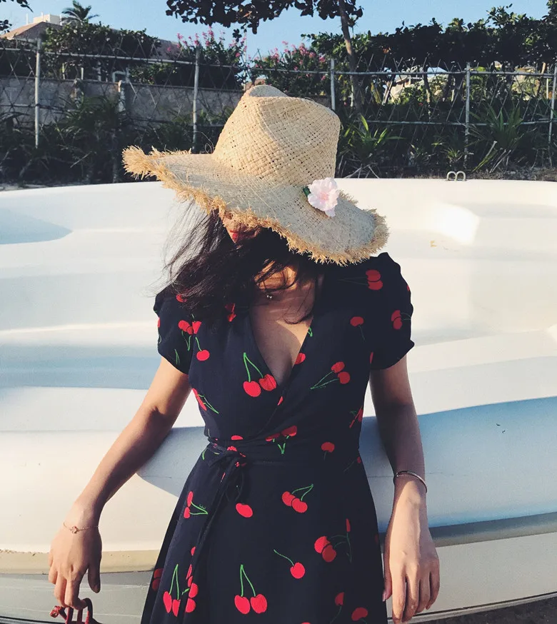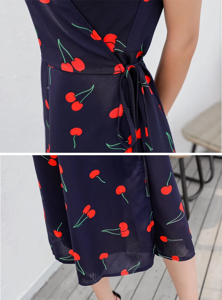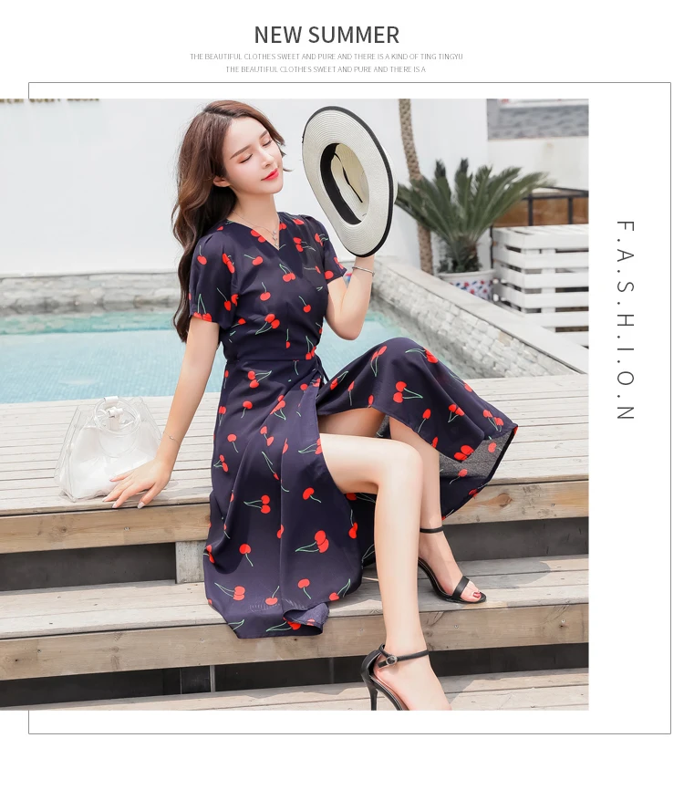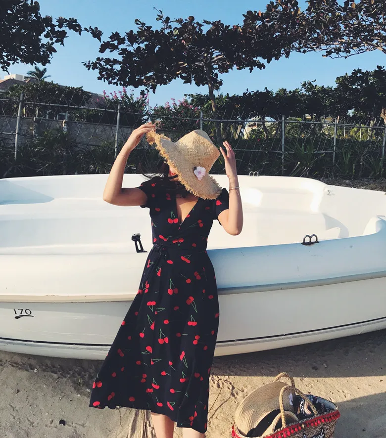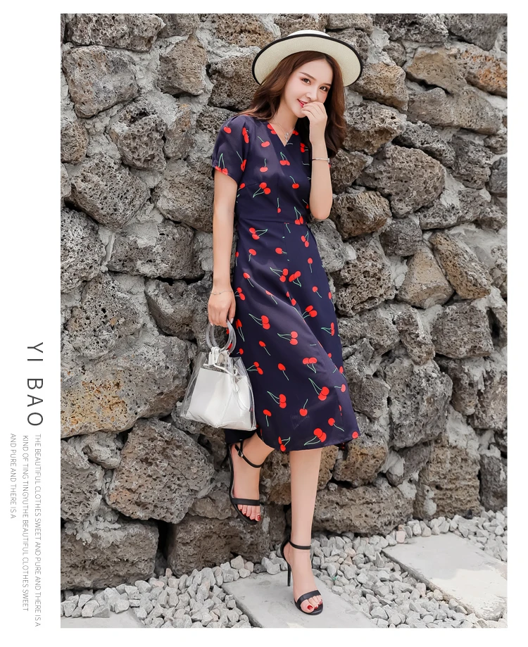Женское шифоновое платье миди, винтажное французское платье с коротким рукавом и V-образным вырезом, модель размера плюс S-4XL на лето, платье с вишневым принтом