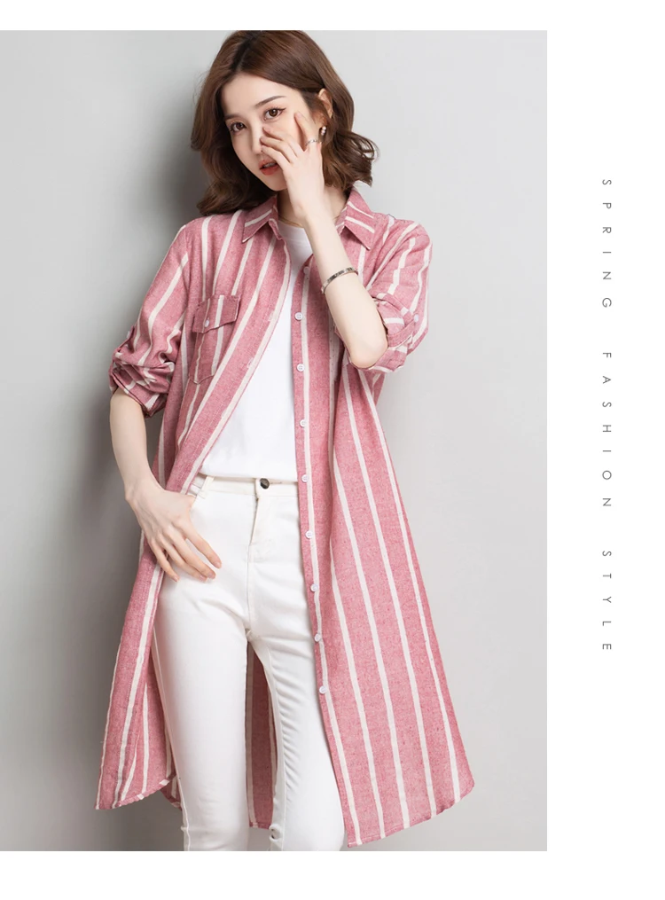 Блузка женская из хлопка и льна, в Вертикальную Полоску, с длинным рукавом