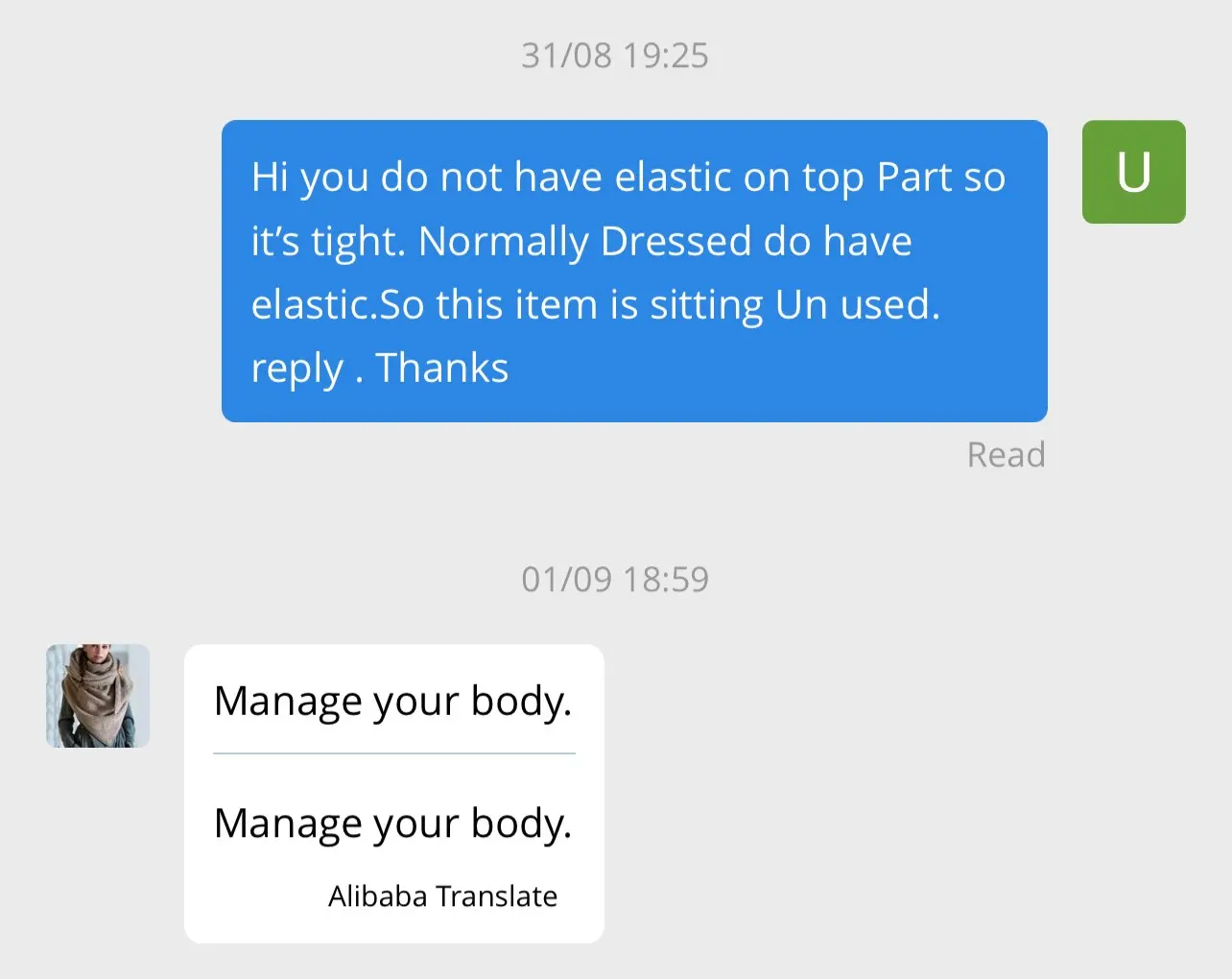 Я купил этот подарок в первый раз в этом магазине. Но у платья нет эластичности сверху. Я отправлю сообщения для помощи продавцу. Продавец отвечающий на очень негативные сообщения, когда-либо управлял вашим телом. Не покупайте товар в этом магазине. Нет помощи и обслуживания клиентов, предоставленных этим магазином. Не покупайте товар у этого продавца.