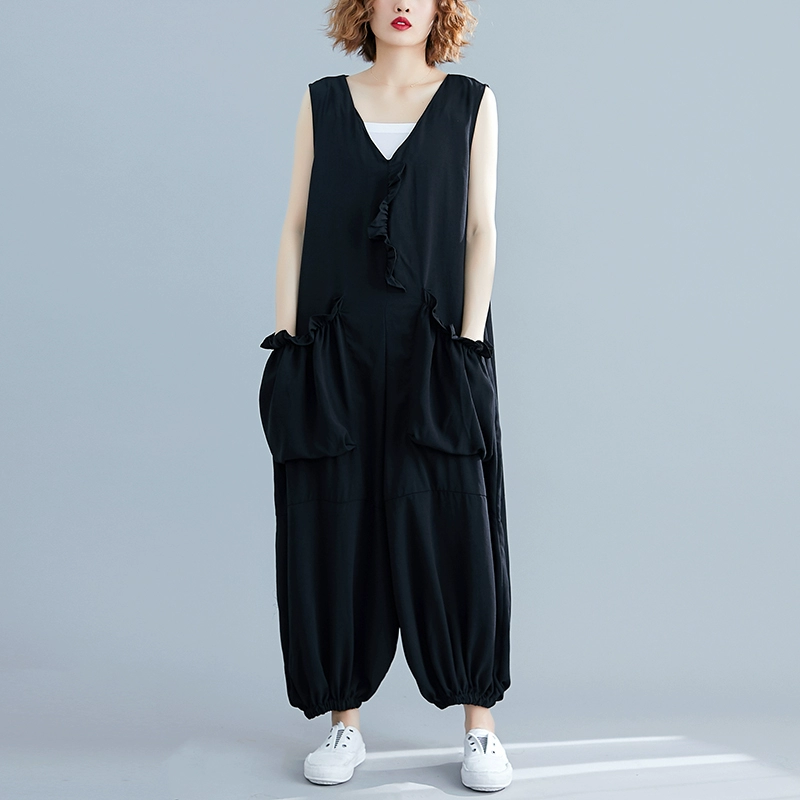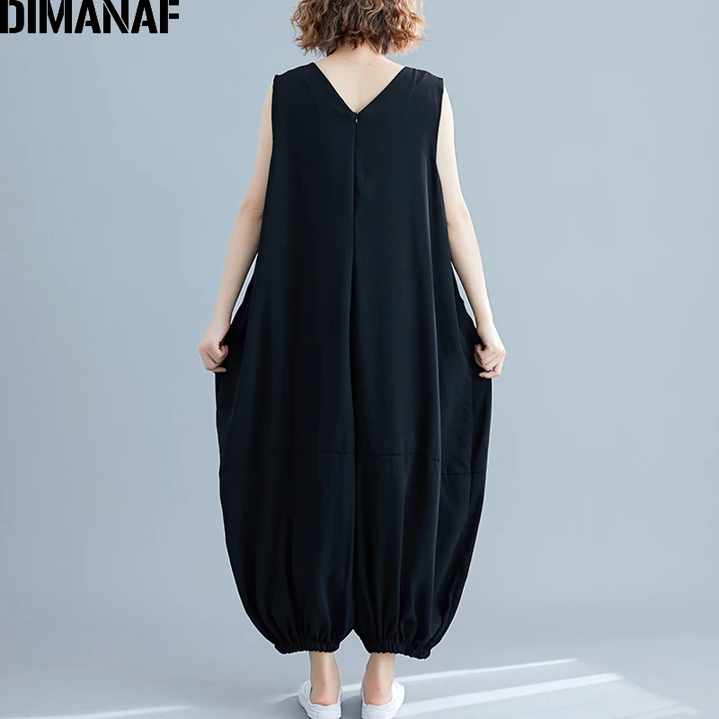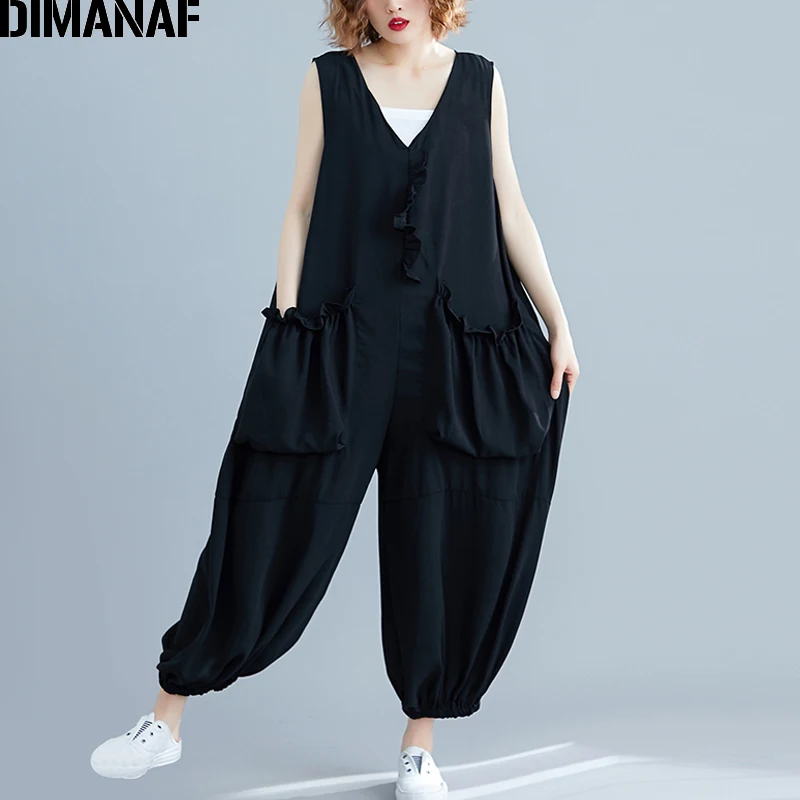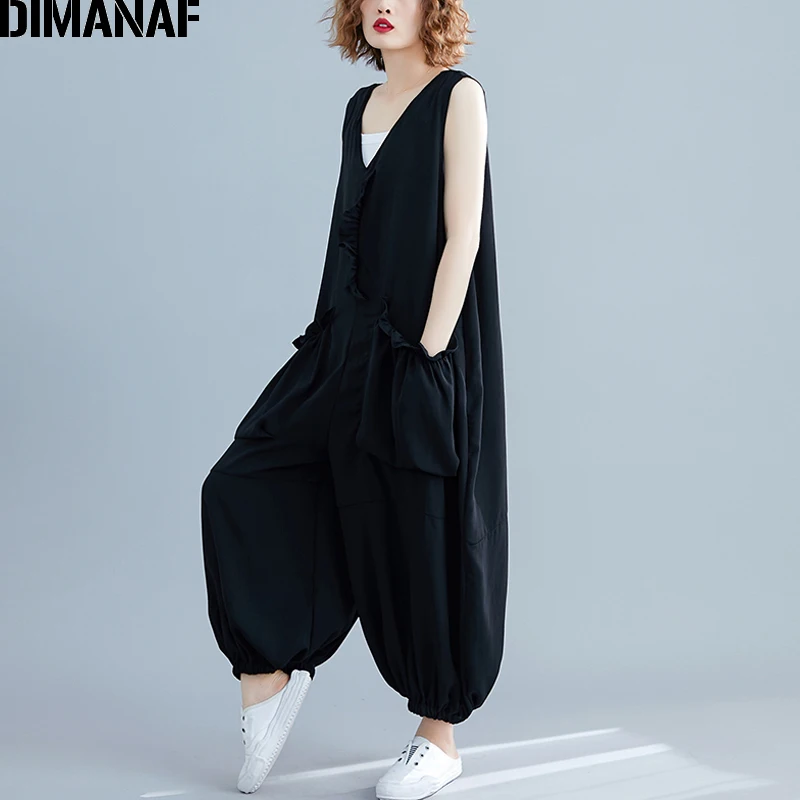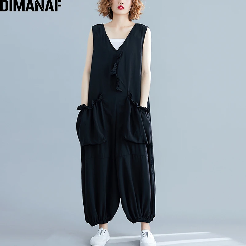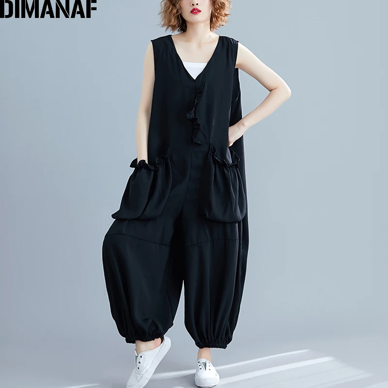 Женский комбинезон без рукавов DIMANAF, Винтажный Длинный комбинезон черного цвета с оборками, просторная Одежда большого размера для лета, 2021