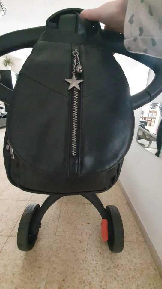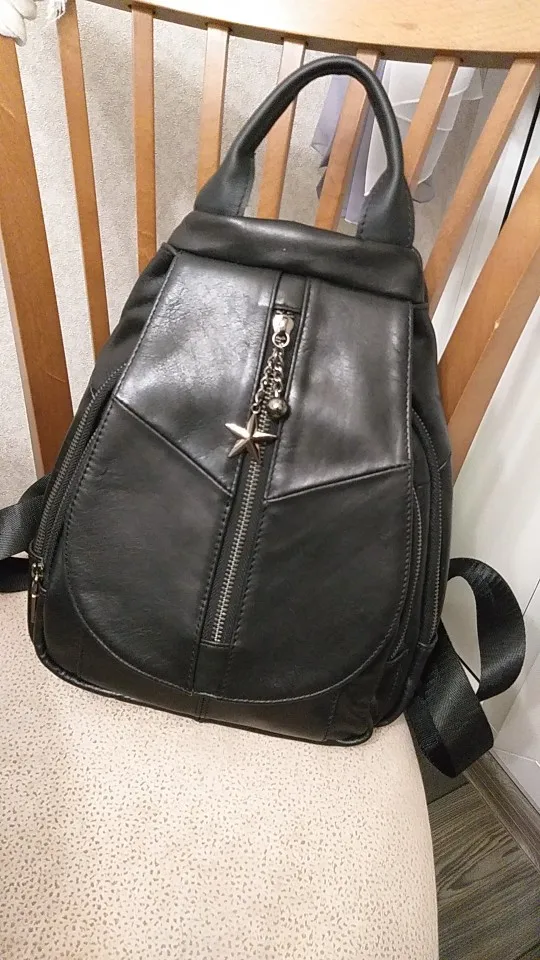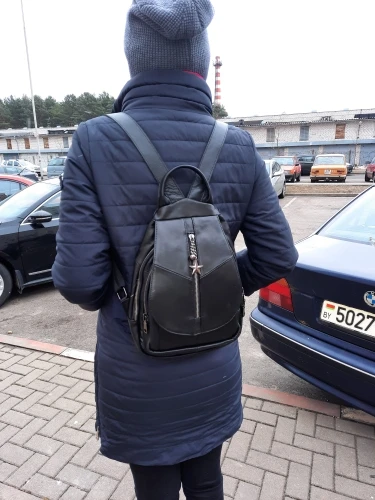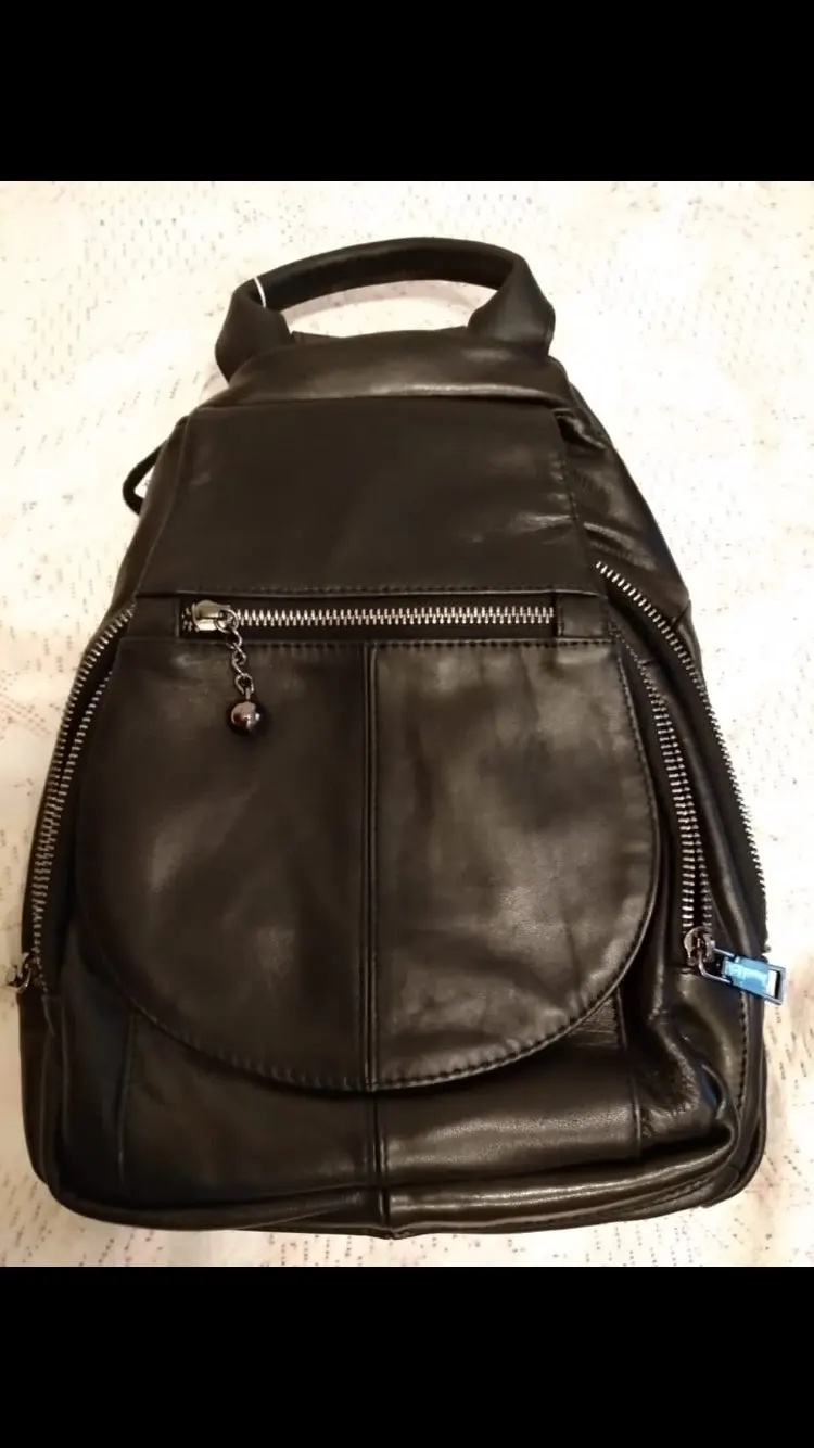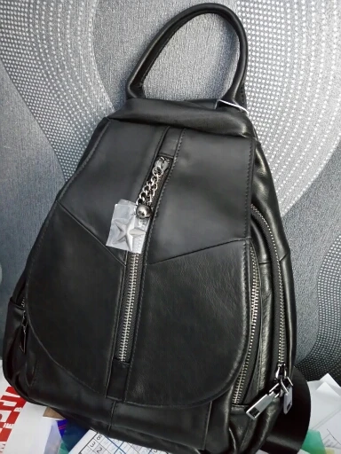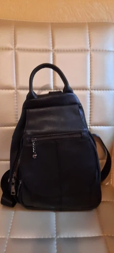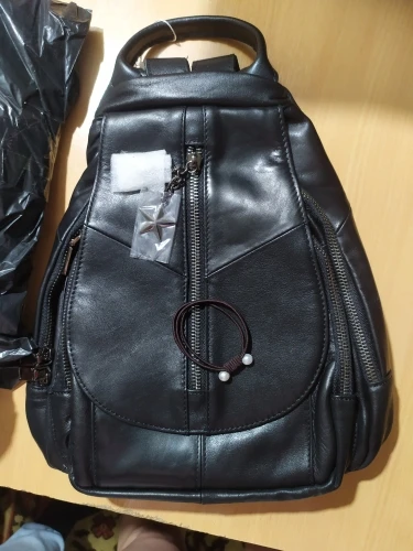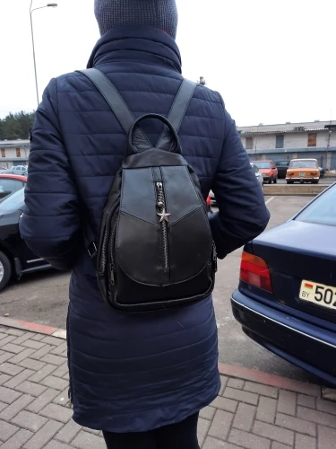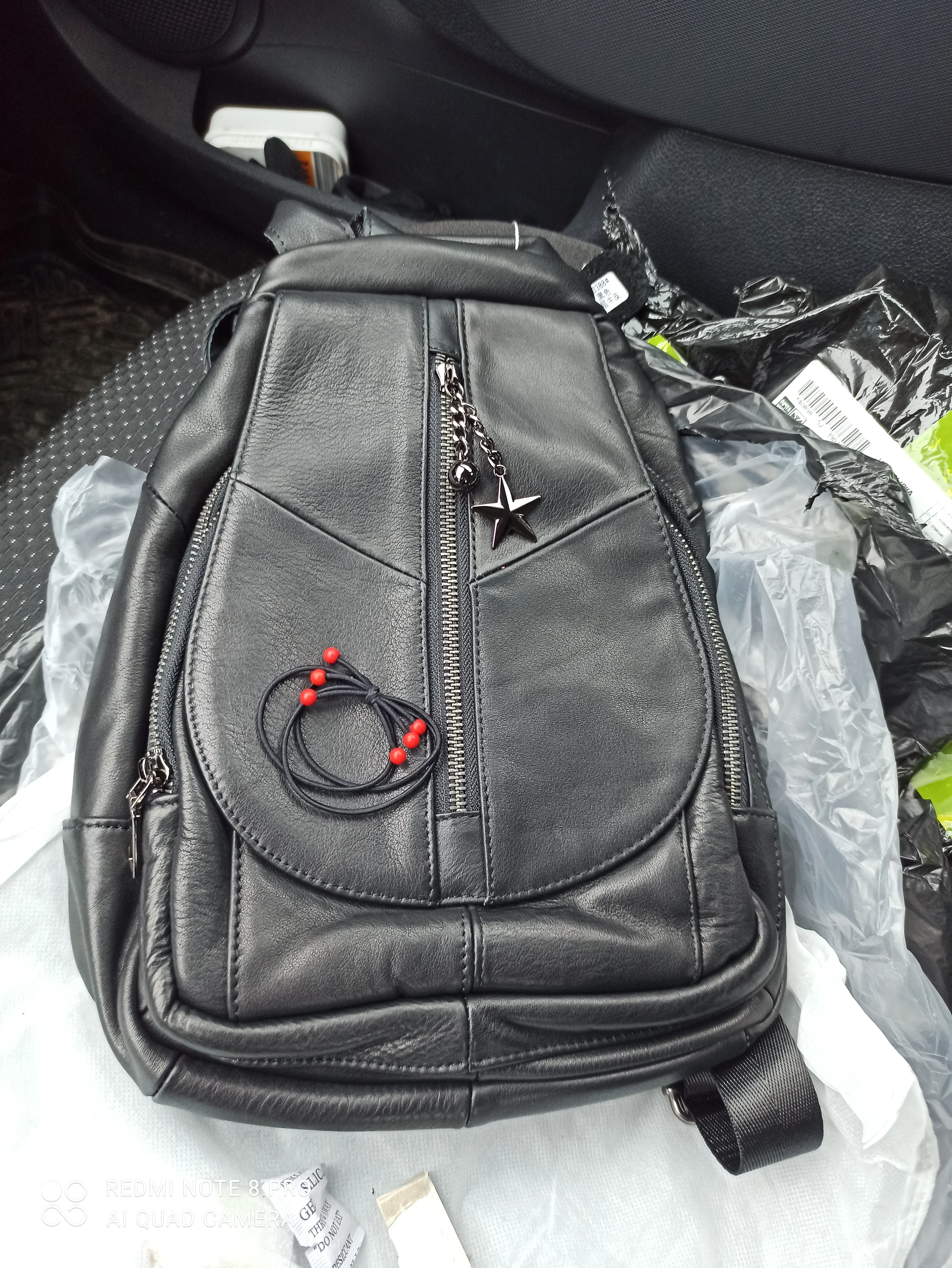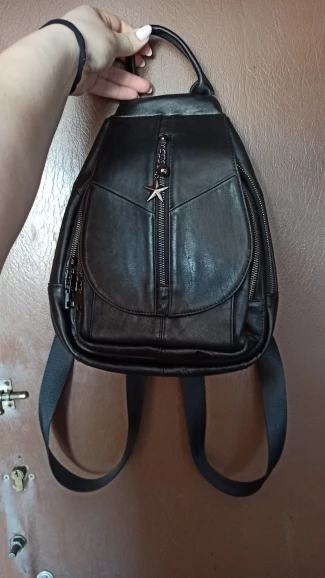 На вид рюкзак качественный, на самом деле выглядит меньше, чем на фото, очень компактный. Матовый, что для меня важно, на вид кожа, приятный на ощупь, много карманов, внешний на молнии, глубокий. Единственное, не нравится звезда с шаром, сняла...