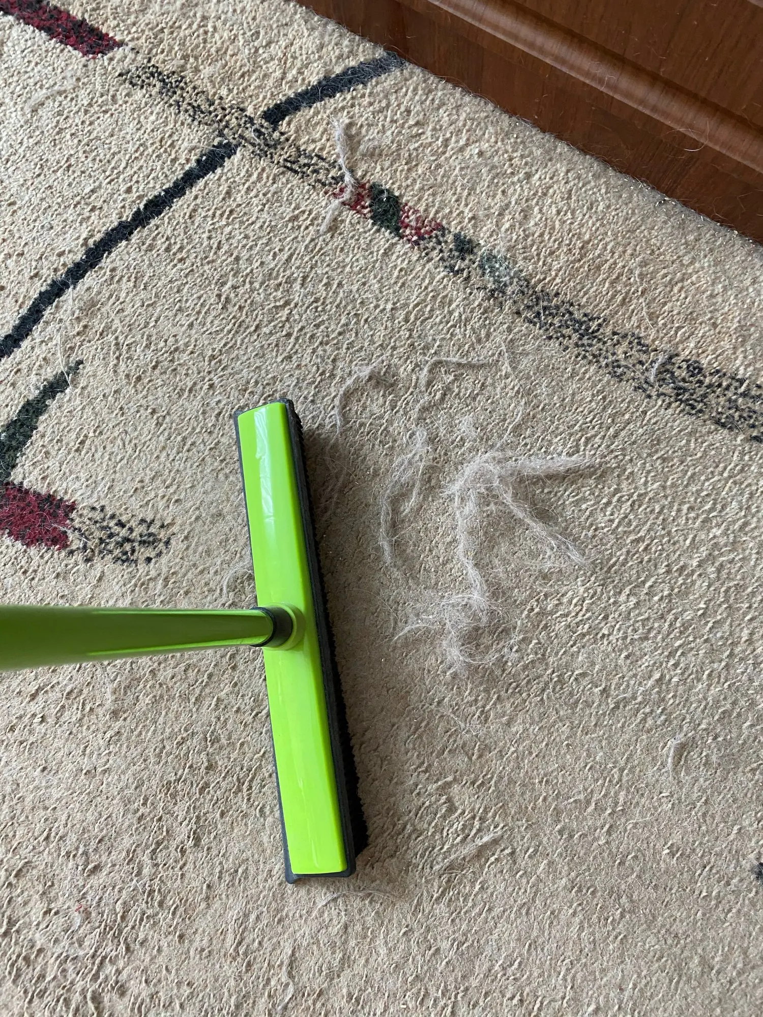 Работает хорошо. Легко получает все собачьи волосы от моего коврика. Рекомендуем любому владельцу собаки!