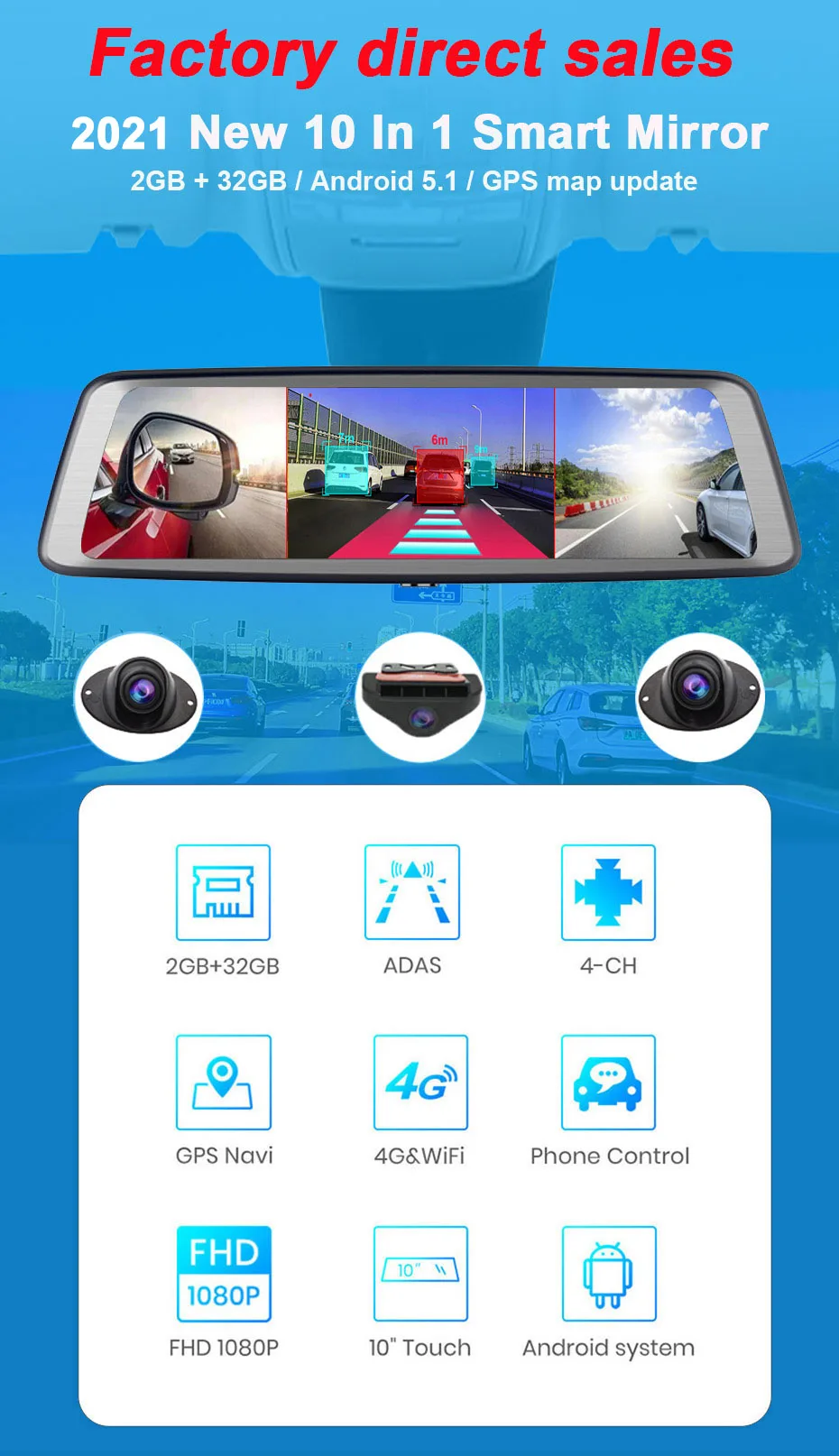 > Управление сглаживанием: MTK6735 1,3 Ghz Cortex-A53,GPU Mali-T720MP3,450MHz, 22,9 Gflops > Поставляется с объективом 4CH для безопасной парковки. Запись фронтальной и задней камеры одновременно. Камера с правой и левой глубиной для отображения изображения для безопасной парковки. > Все это зеркало IPS экран 10 дюймов. > Тройной широкий вид сзади по технологии потокового видео. > 4G модуль для sim-карты (Интернет) + WIFI модуль маршрутизатор = серфинг быстрее > Автопомощь мобильное приложение + Интернет-серфинг = удаленный монитор > Усовершенствованные системы сигнализации вождения (LDWS/ FCWS/FVMA). Стандартная посылка включает:1 х Автомобильный видеорегистратор3 x задняя камера (опция)1 х задний кабель1 x Антенна GPS1 х Кабель питания1 x универсальная основа1 x специальный кронштейн 1 # (или другой специальный кронштейн, который вы хотите)