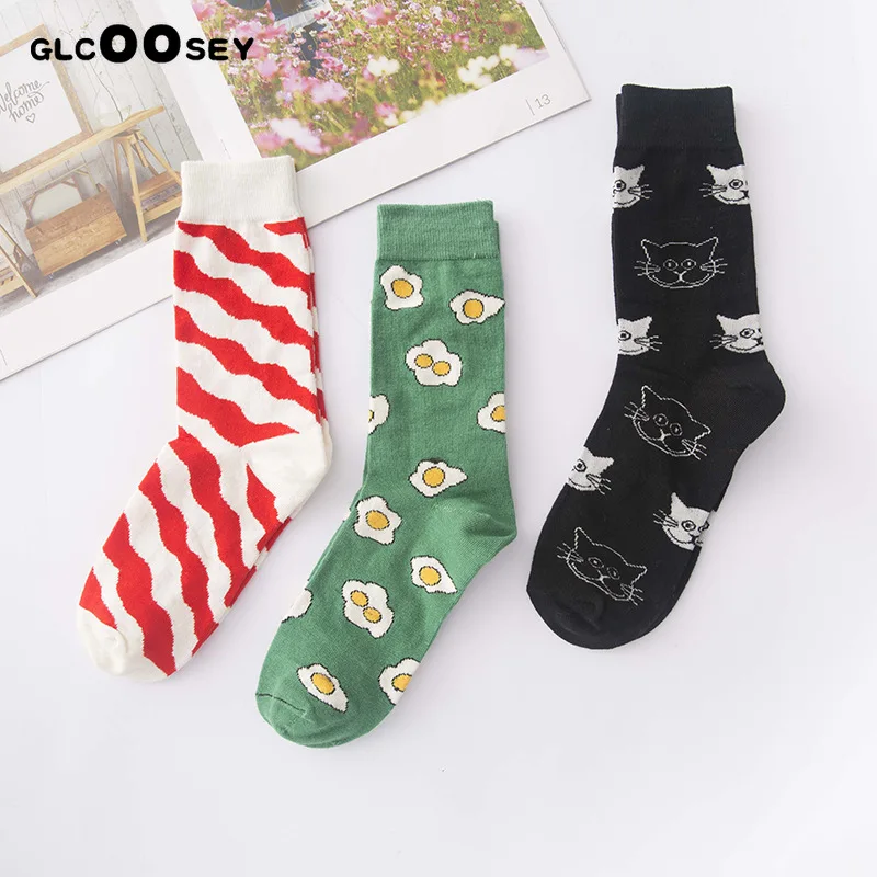 Носки женские хлопковые в полоску с рисунком сердечек, ананасов, кошек, стрел, яиц, молока