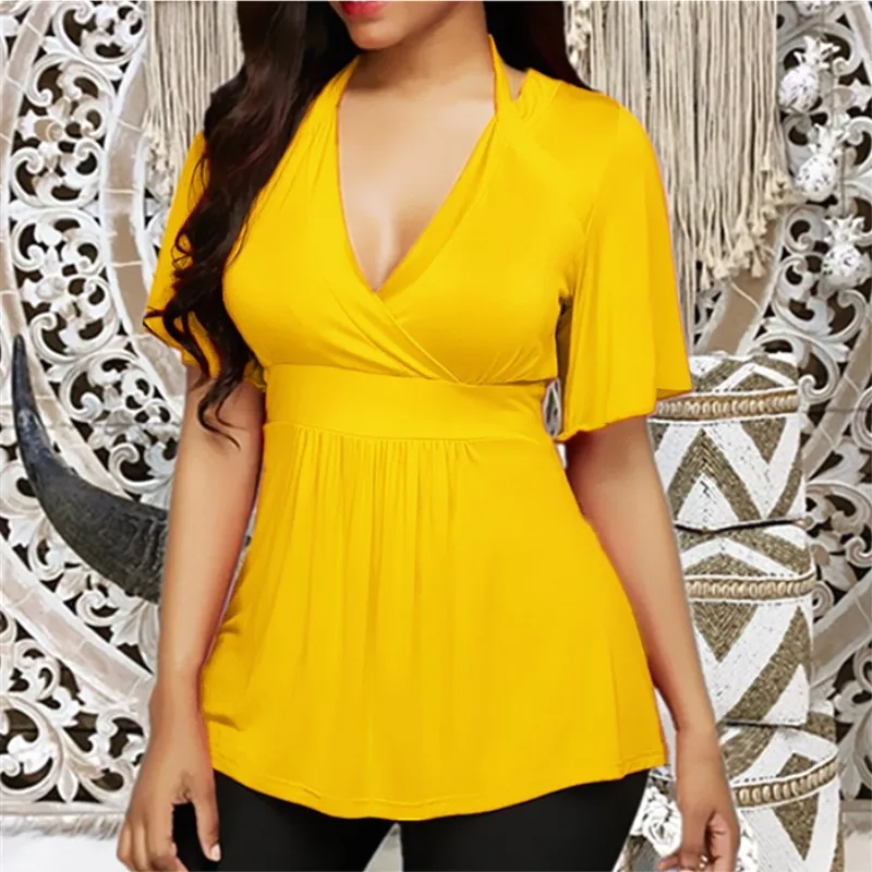 Футболка женская однотонная с коротким рукавом, пикантная короткая рубашка с V-образным вырезом, повседневный топ с облегающей талией, повседневный топ размера плюс, 5XL, 2019