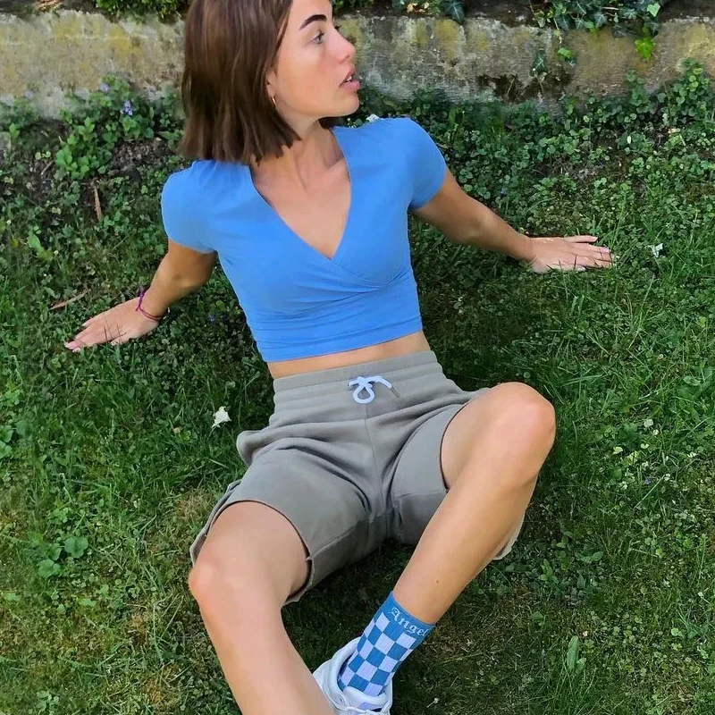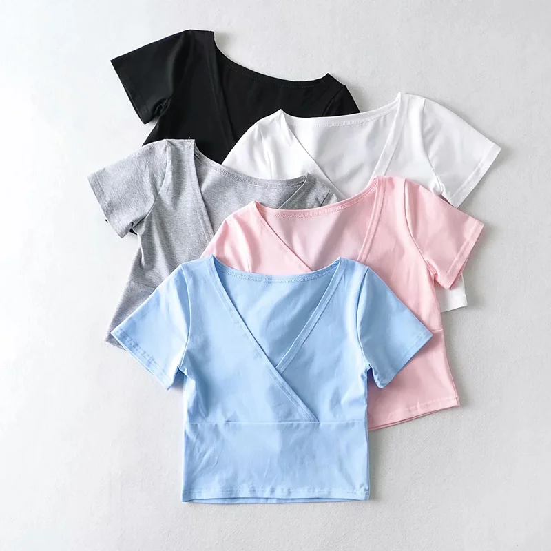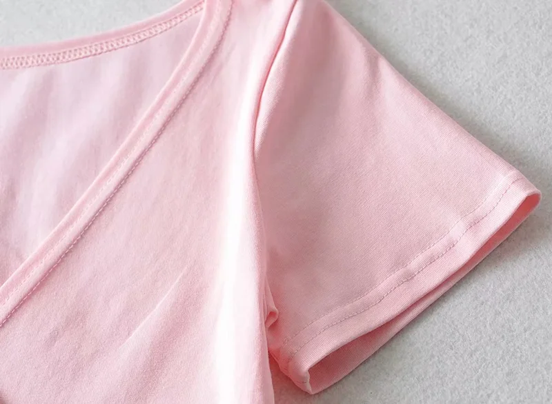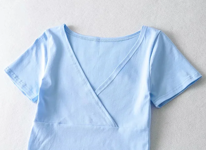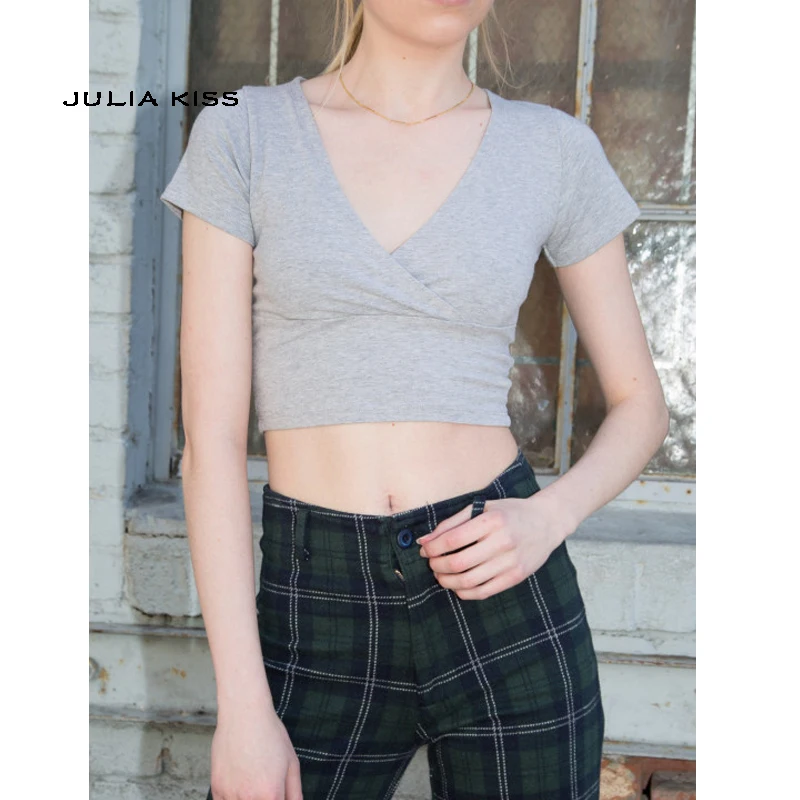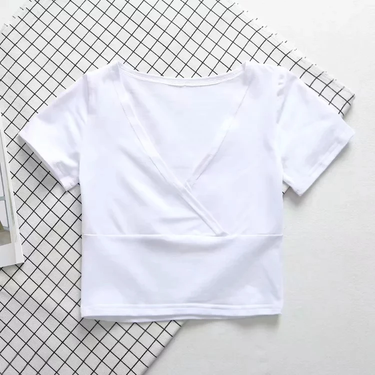 Женский из смеси хлопка, короткий укороченный топ с v-образным вырезом и коротким рукавом