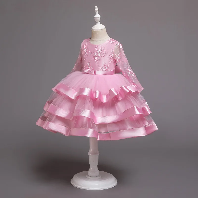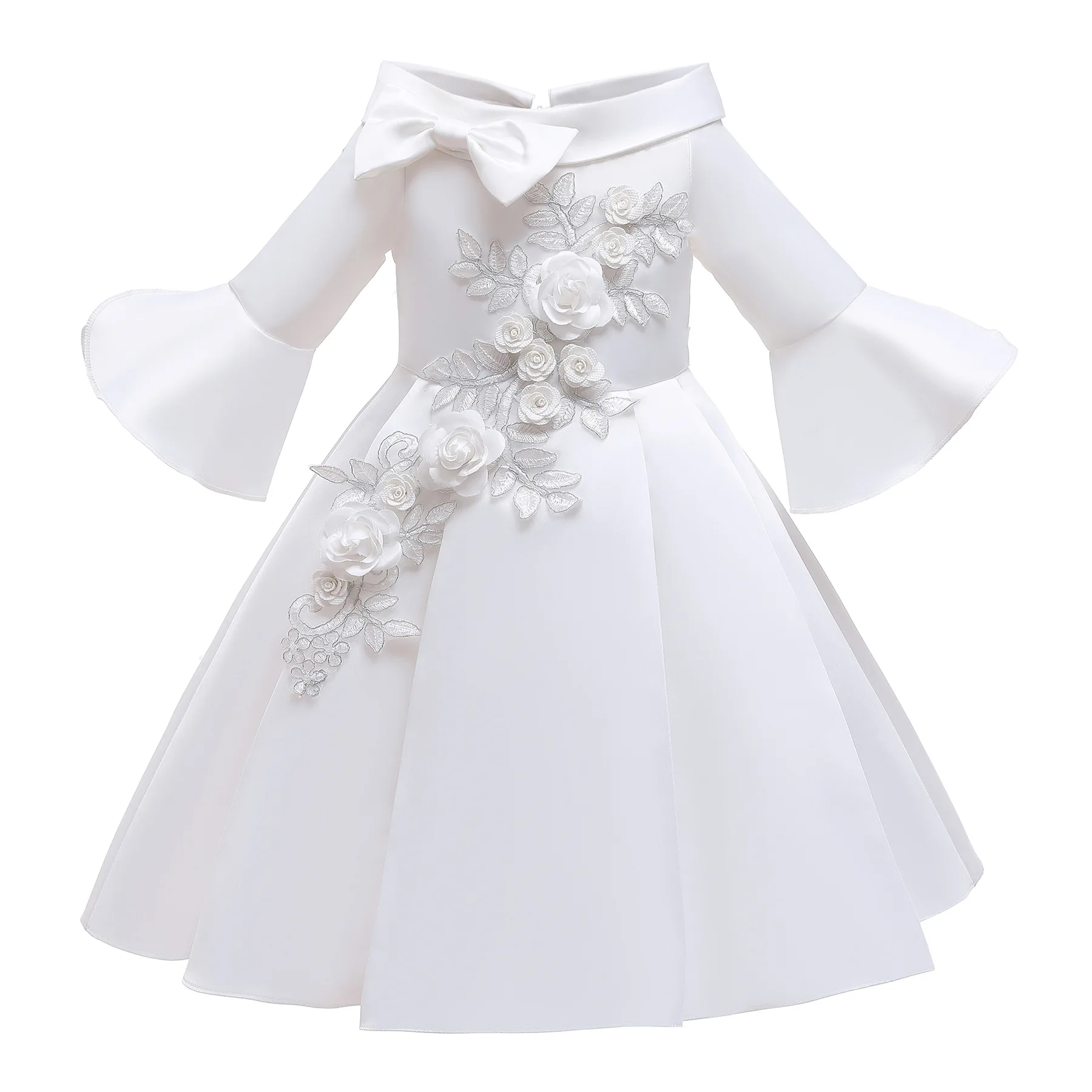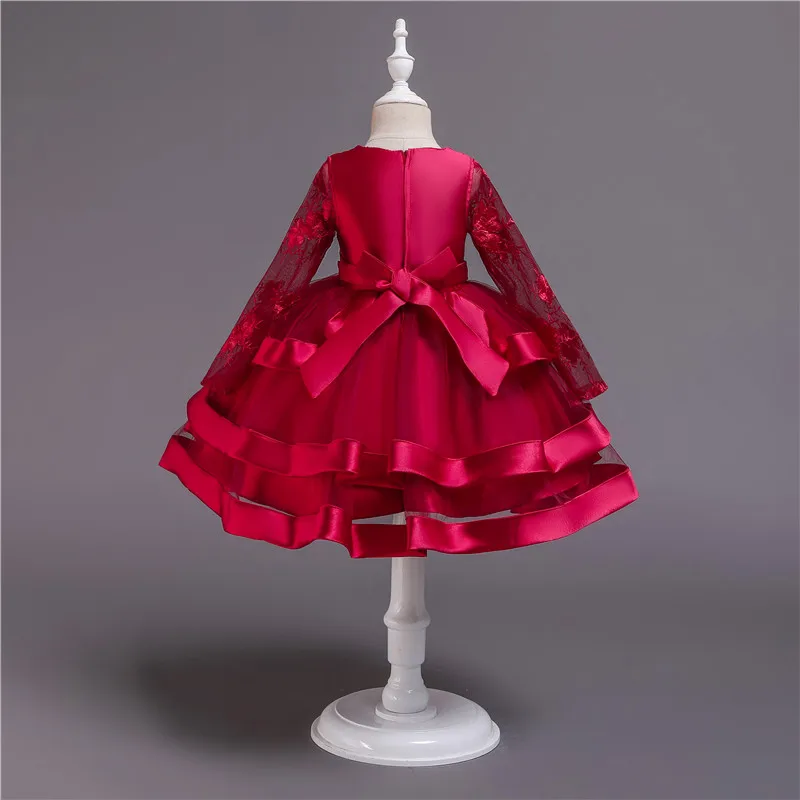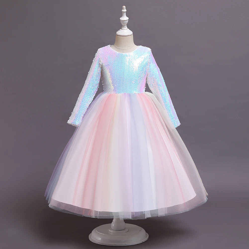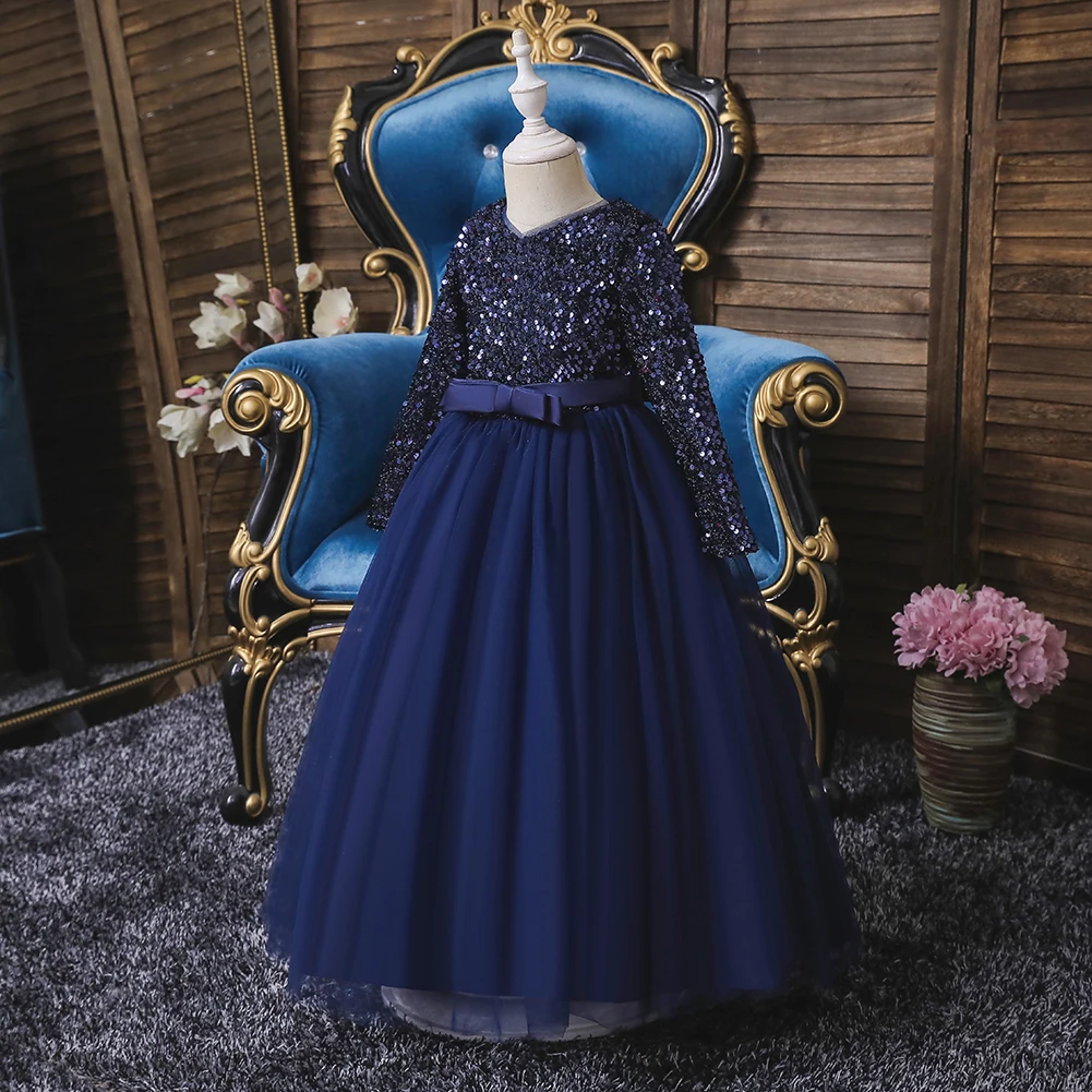 Бальное платье с длинным рукавом и блестками для девочек, атласное элегантное кружевное платье принцессы с цветами для девочек, одежда для детей на Рождество и свадьбу, официальная одежда