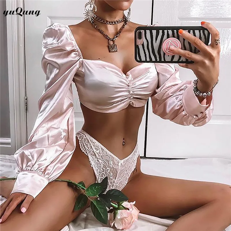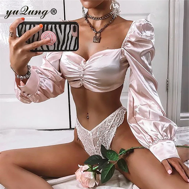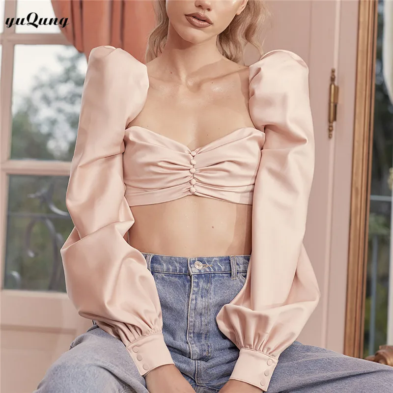 Yuqung, винтажный женский топ с буффами и длинным рукавом, Шелковый Атласный укороченный топ и блузки для женщин 2020, рубашка с квадратным вырезом и пуговицами, туника