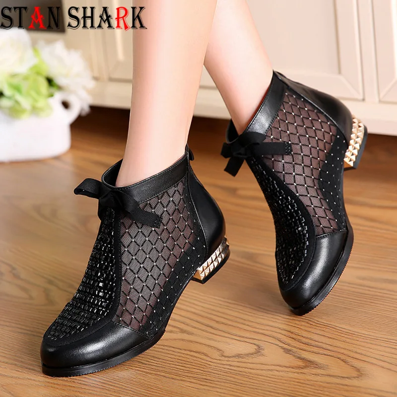 Новая женская летняя обувь из натуральной кожи Босоножки с открытым носком ботинки с сеткой на толстом каблуке Mujer сандалии-гладиаторы из сетчатой ткани, Размеры 35-41