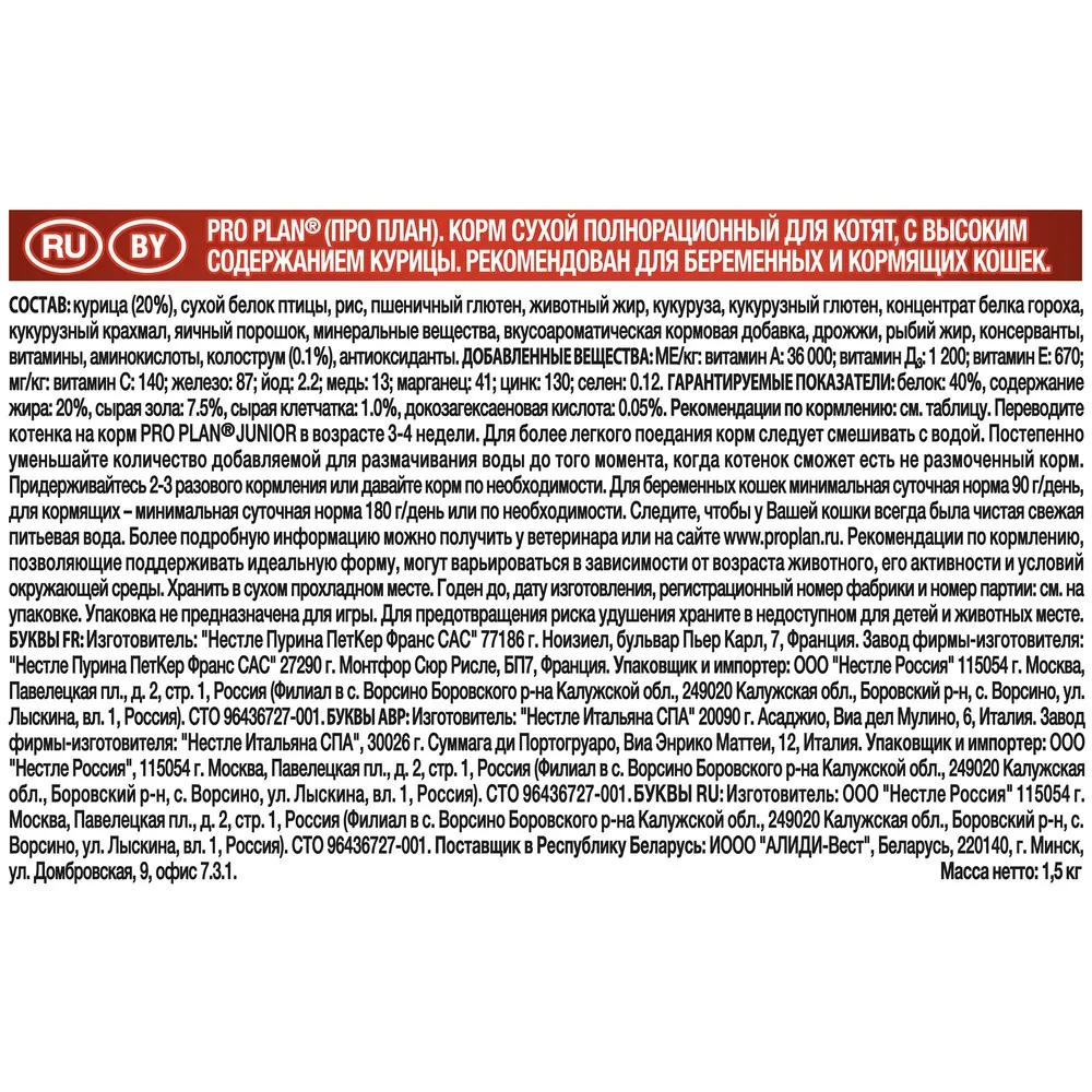 Переводите котенка на корм Pro Plan® JUNIOR в возрасте 3-4 недели. Для более легкого поедания корм следует смешивать с водой. Постепенно уменьшайте количество добавляемой для размачивания воды до того момента, когда котенок сможет есть не размоченный корм. Придерживайтесь 2-3 разового кормления или давайте корм по необходимости. Для беременных кошек минимальная суточная норма 90 г/день, для кормящих – минимальная суточная норма 180 г/ день или по необходимости. Для более подробного объяснения консультируйтесь с Вашим ветеринарным врачом. Рекомендации по кормлению, позволяющие поддерживать идеальную форму могут варьироваться в зависимости от возраста животного, его активности и условий окружающей среды. Следите за весом Вашей кошки и корректируйте количество даваемого корма. Следите, чтобы у Вашей кошки всегда была чистая, свежая питьевая вода. Для здоровья Вашей кошки регулярно консультируйтесь с ветеринарным врачом.