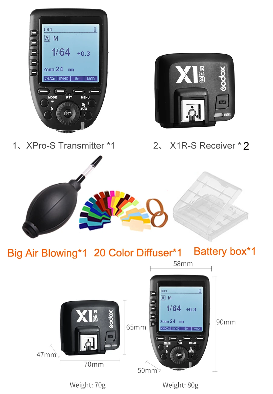 Посылка включает в себя: 1 * триггер Godox Xpro-C/N/S 2 * X1R-S/C/NПриемник(Опционально) 1 * Руководство по эксплуатации