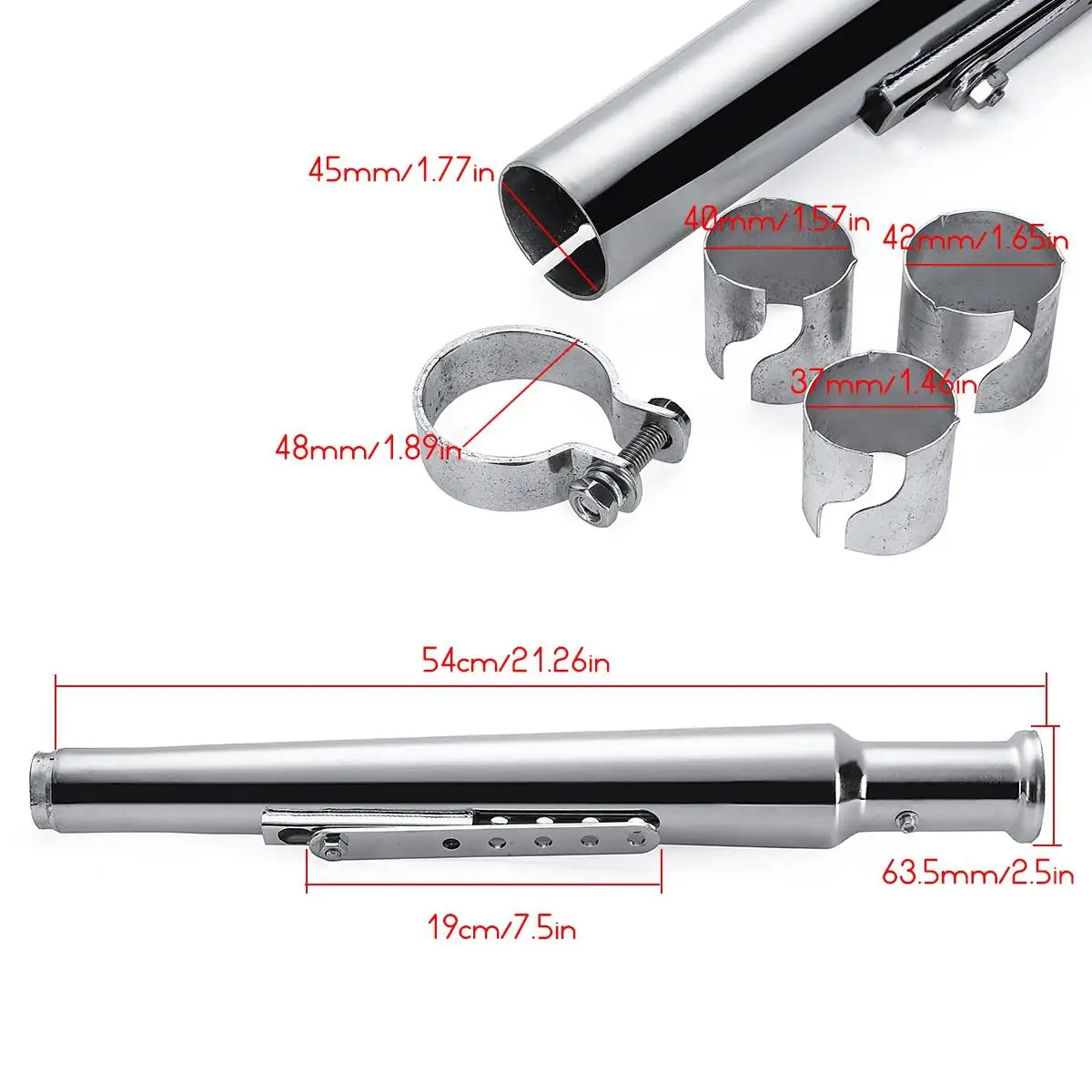Тип F: (Включая 3 редукционные втулки (36 мм, 39 мм, 41 мм))Спецификация: Материал: железоЦвет: черный, серебристыйДлина: 522 ммВходной диаметр: 45 мм/1,77 дюймаДиаметр выхода: 63 мм/2,48 дюйма