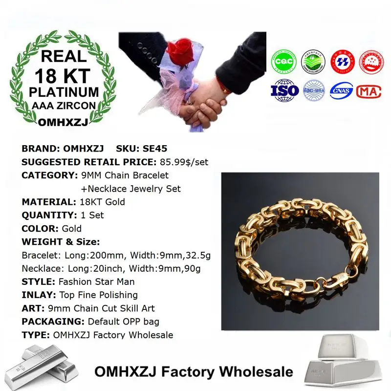 Мужской свадебный подарок OMHXZJ, золотая цепочка толщиной 9 мм, браслет из 18-каратного золота + ожерелье, комплект ювелирных изделий SE45