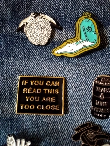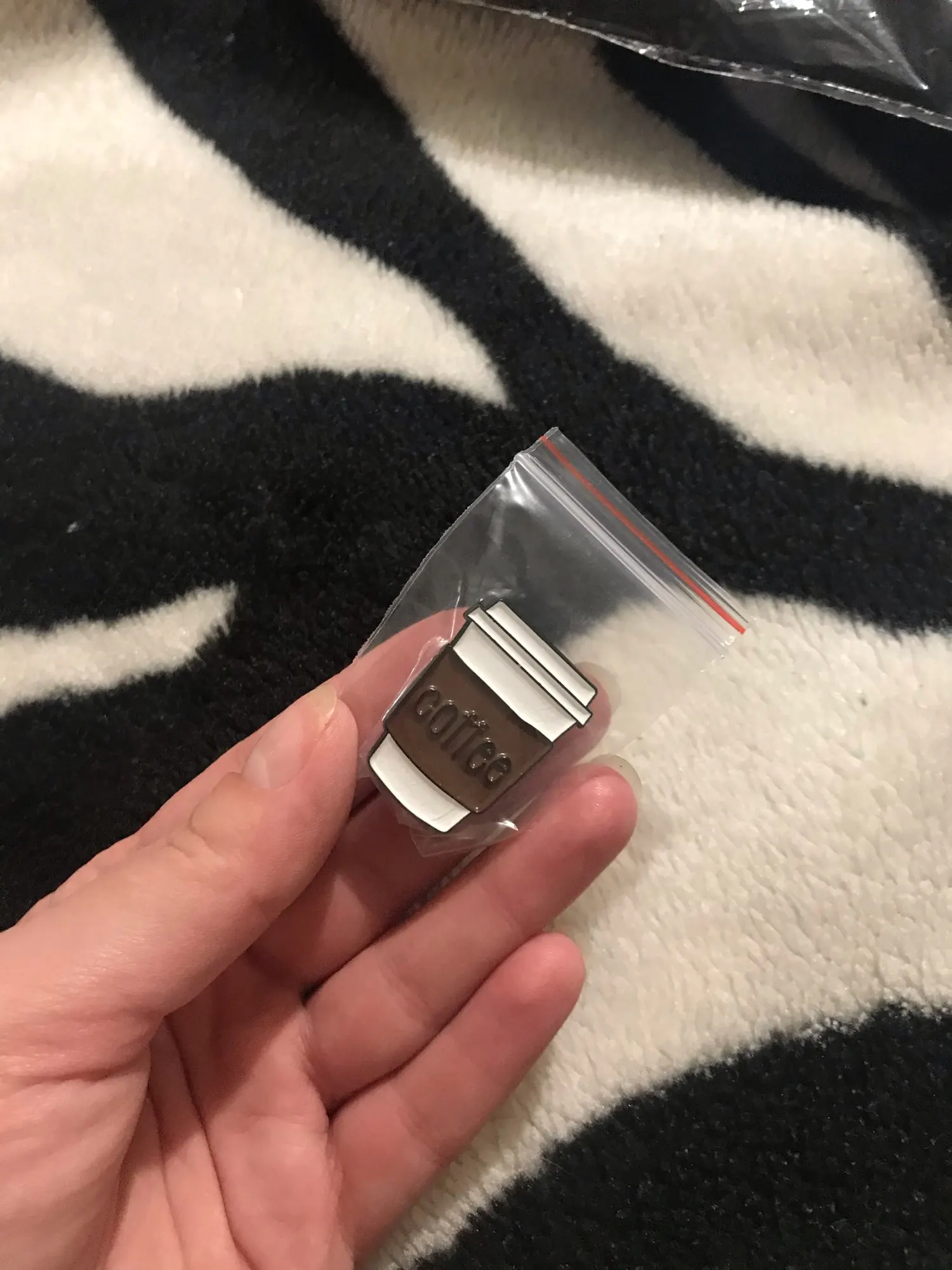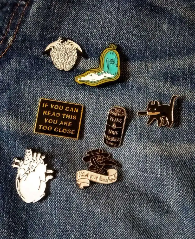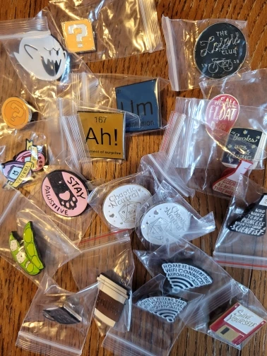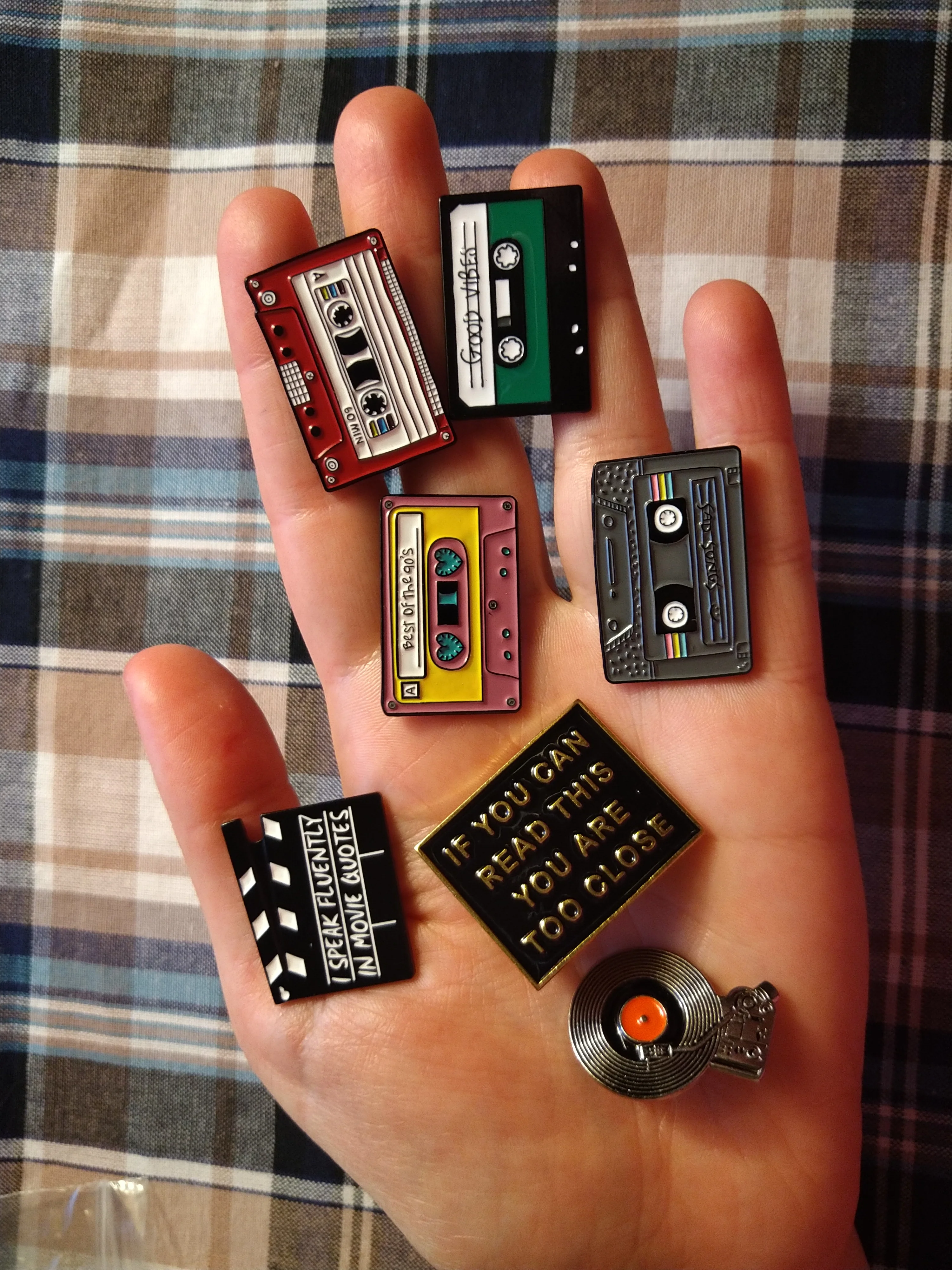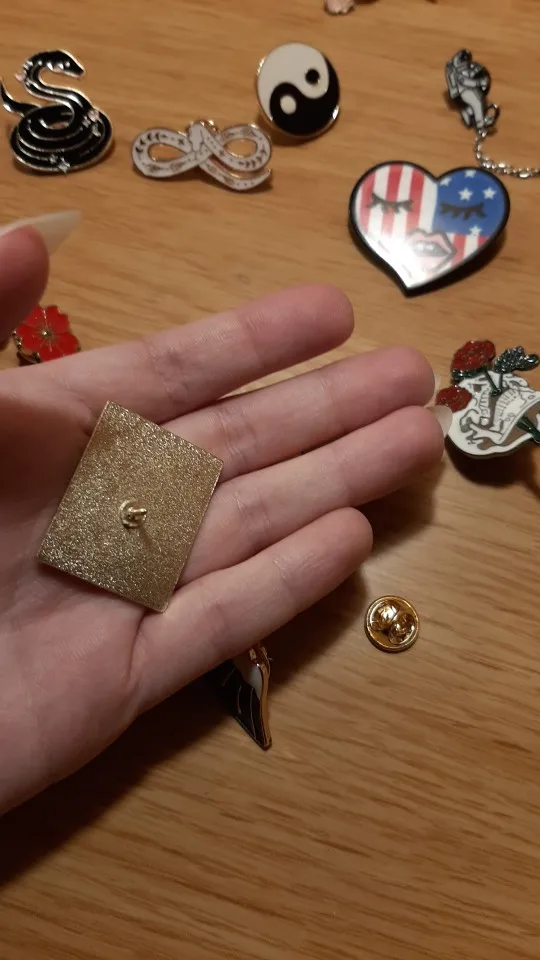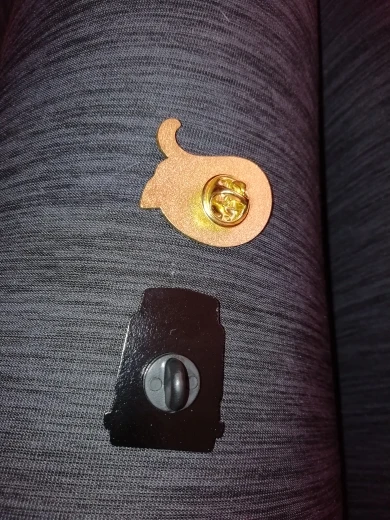 Шла посылка 2,5 месяца. Видимо пешком. Дошла и то хорошо. Значки все супер. На котосердце, вязанных мозгах и Сальвадоровских часах заглушки силикон. Они тугие и держат даже лучше бабочек. На остальных классические бабочки