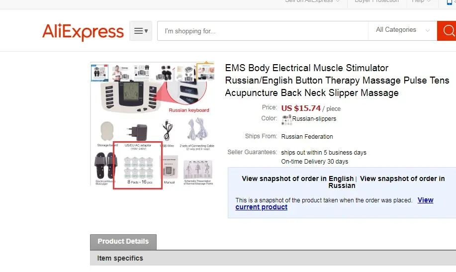 Моя лучшая покупка на али! Выбрала доставку из России. Посылку принёс курьер через 2 дня. Упаковано все замечательно. Теперь о товаре: Это действительно работает. До этого покупала подобные массажёры, но импульс был очень слабый и чувствовалось просто покалывание. С этим мышцы сокращаются. Начала использовать каждый день. Позже дополню отзыв, есть ли результат.
