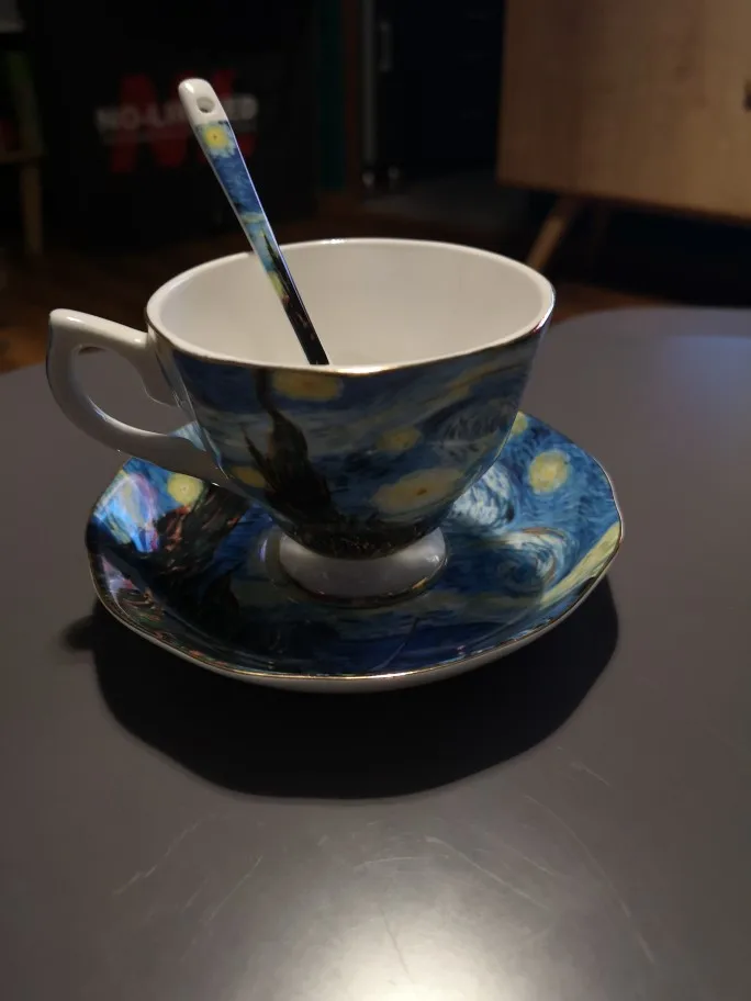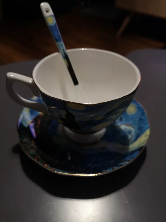Продавец упаковал очень надёжно, еле открыла, но всё целое зато. Красивая чашка, радует глаз, очень удобная. Конечно, не 220 мл, но прелесть. Вот с ложкой ситуация на любителя. Фарфоровая ложка очень неприятно скрежечет при перемешивании, если также возите ложкой по дну - скорее всего использовать вряд ли будете.