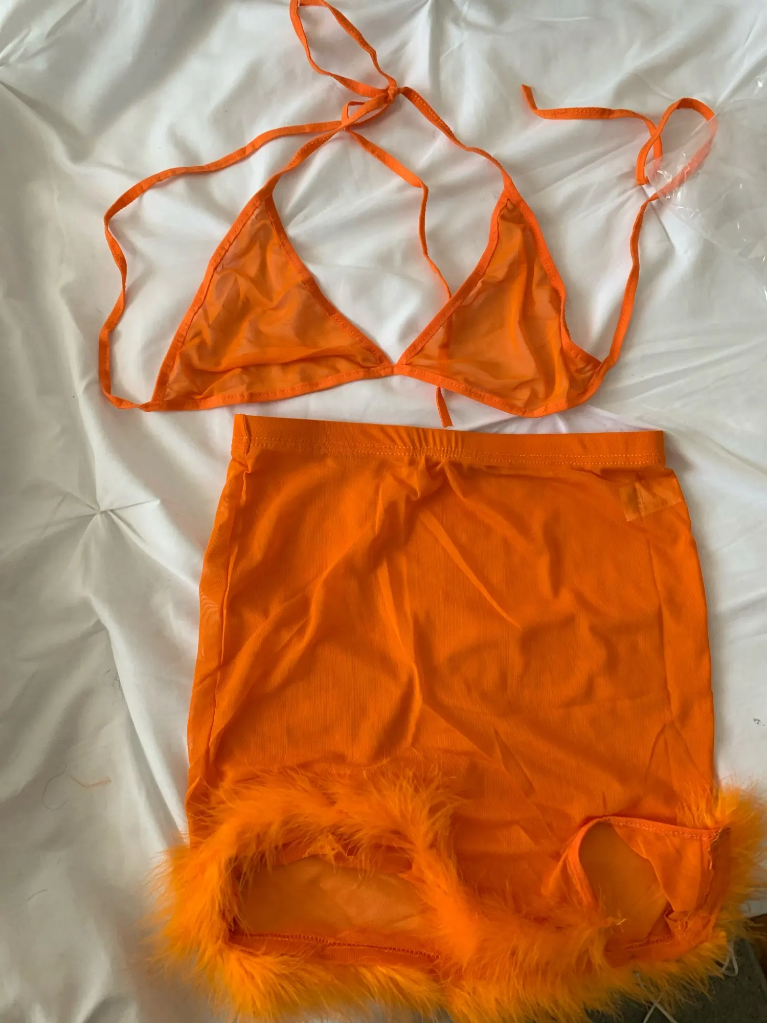 Женский комплект из 2 предметов, однотонная пышная майка-топ, сетчатая юбка, оранжевая прозрачная короткая мини-юбка, пикантный комплект из двух предметов