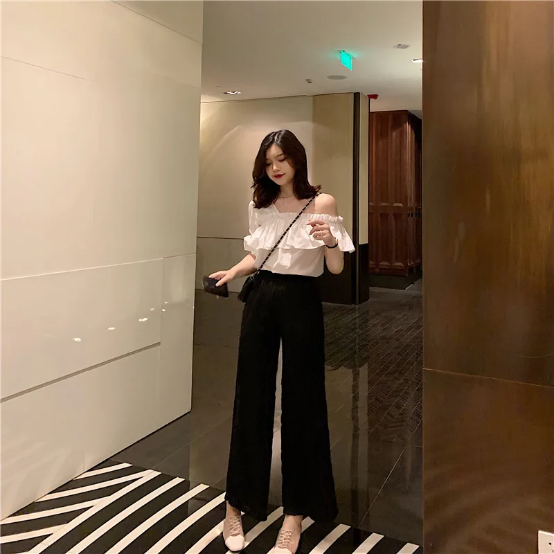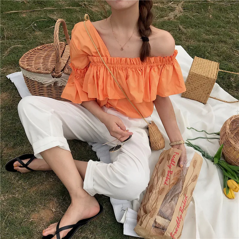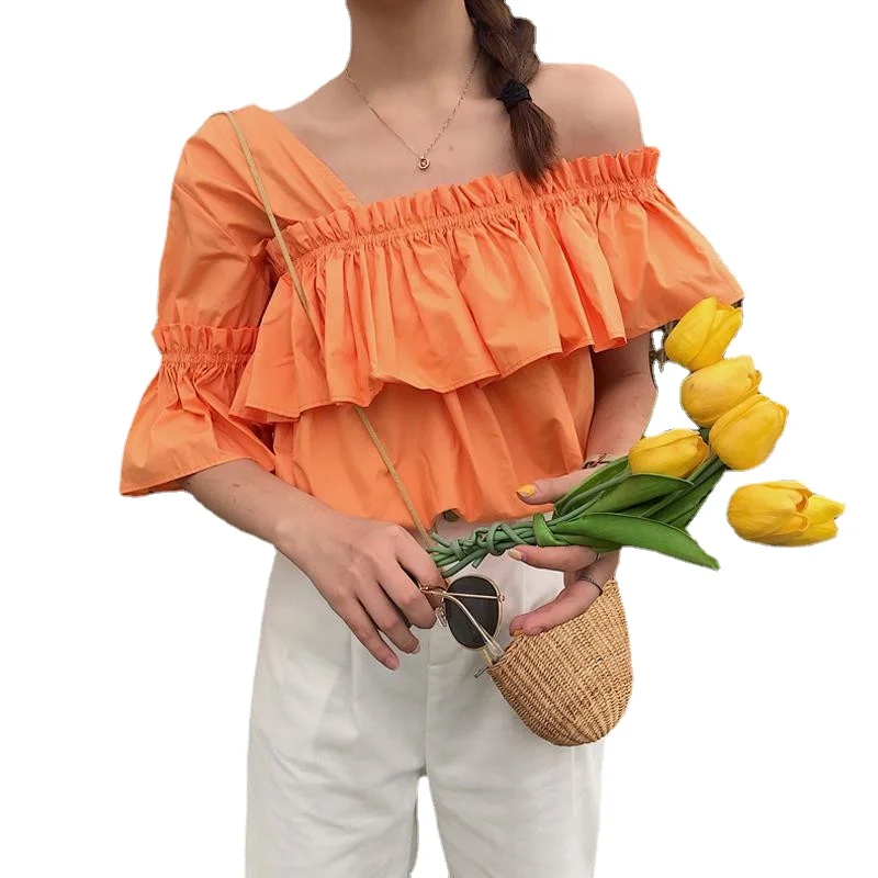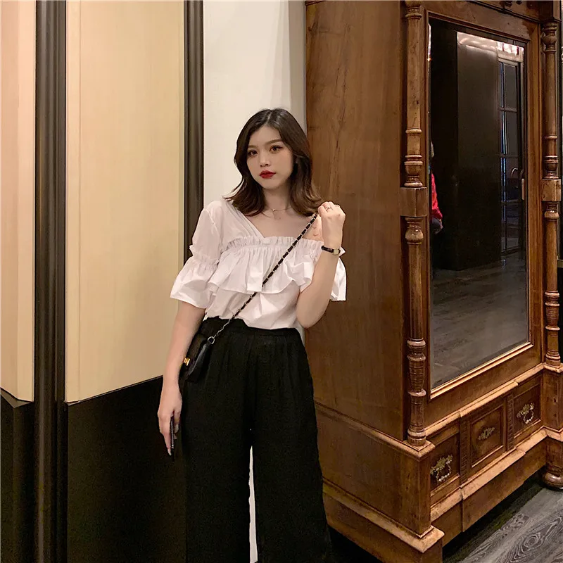 Женская блузка с расклешенными рукавами, элегантная белая блузка с оборками, Асимметричный топ с косым воротником, лето 2019