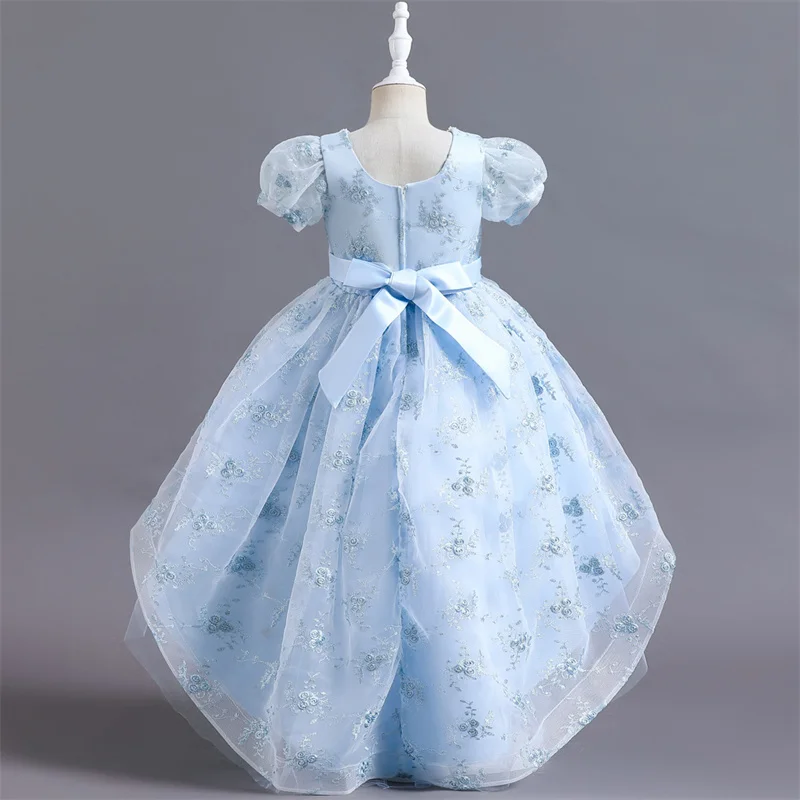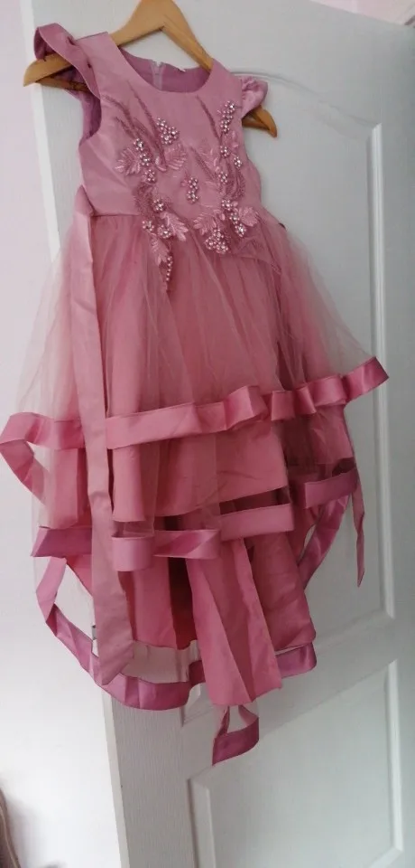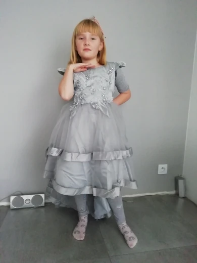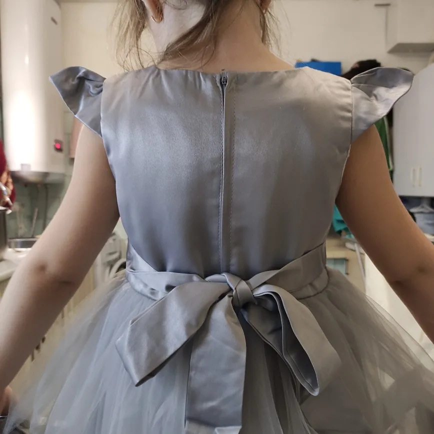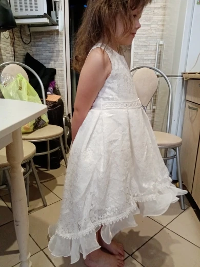 Платье понравилось , доставка быстрая.заказывали на 6,5 лет 9 размер чуть волочится шлейф ,но совсем немного , очень удобно что есть пояс