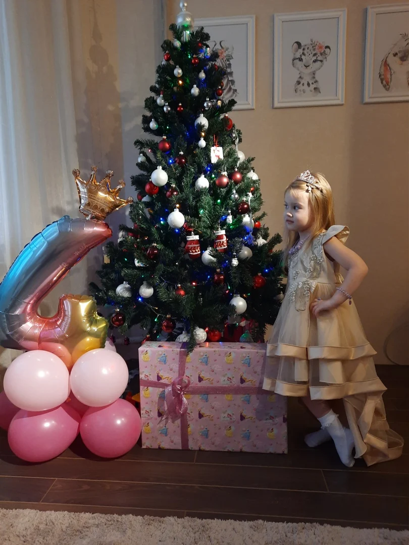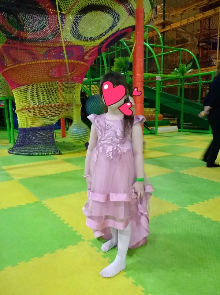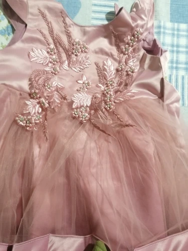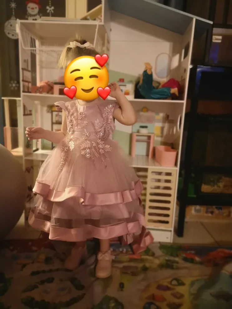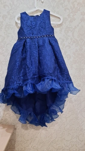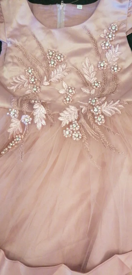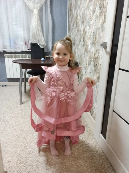 Платье очень красивое. Качество хорошее. Декор немного небрежно пришит. Но этого не видно. Такое и надеть настырно и подарить. На рост 105 взяла 5т. Маркировка на платье 120. Будет шлейф чуть на полу. А так, хорошо подойдёт, и с запасом. Я так и планировала