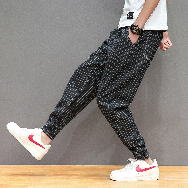 Мужские шаровары, синие, черные, в полоску, джинсовые брюки для мужчин, тренд, свободные, в стиле хип-хоп, джинсы, Мужские джоггеры, спортивные штаны, размер 28-42