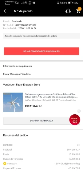 Будьте осторожны при покупке в этом магазине, так как они говорят, что делают бесплатную доставку, и в конце концов это не так, У них хороший балл, но если вы покупаете из Канарских островов, я не рекомендую его, так как я купил аэрогенератор, и он никогда не приходил ко мне, и у меня никогда не было решения от продавца или aliexpress. Я потерял деньги и товар.