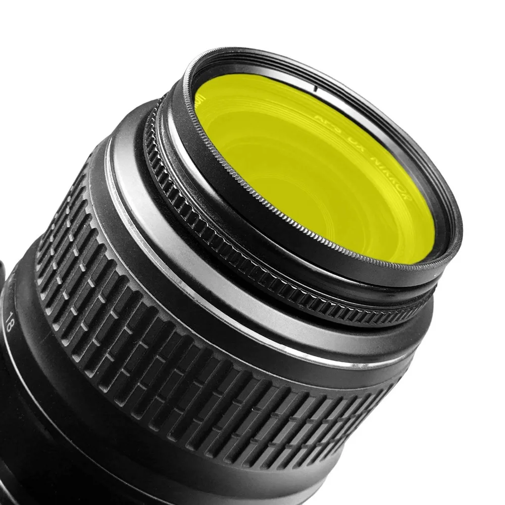 Желтый цветной фильтрПолезно в ландшафтной фотографии, так как они помогают белым облакам выделяться сильнее с голубого неба.Зеленые тона также выходят больше. Зеленый визуально уменьшает пятна кожи в портретной фотографии.Фильтр обладает жестким корпусом и прост в использовании. Дополнительный Метчик для нарезания внутренней резьбы позволяет добавить другой фильтр или фильтры подсветки.