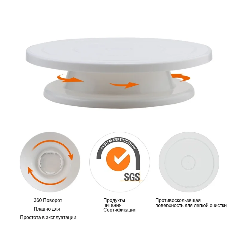 Полученный товар соответствует описанию и фото. Но, конструкция довольно таки хлипкая. И какая-то "игрушечная" что ли... в общем, для забавы пойдет, а для серьезного увлечения десертами лучше другие поворотные столы рассмотреть. с продавцом не общалась.