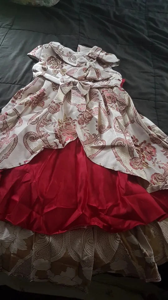 Выглядит так, как показано на картинке, даже если на фотографиях красный цвет. Милый материал, хорошо сшитый вместе. Красивые детали. Он даже имеет небольшой поезд, который делает его более принцессой. Перед тем, как носить его, нужно будет прогладить, и я думаю, что надену еще одну фатиновую юбку под нее, чтобы она больше торчалась. Но все вместе я очень доволен своей покупкой и рекомендую это платье другим.