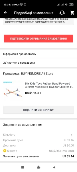 Доставка (14днів) до відділення Укрпошти -дуже швидко! Ціна ~33грн./шт. Літак як на фото, хоча сподівання були, що трохи більший. Крила з дуже тонкого пінопласту, наявні вм'ятини, сподіваюся не критично. Дерев'яна рейка дугою, спробую випрямити під вантажем. Товар та продавця - РАДЖУ! 5* (*****).