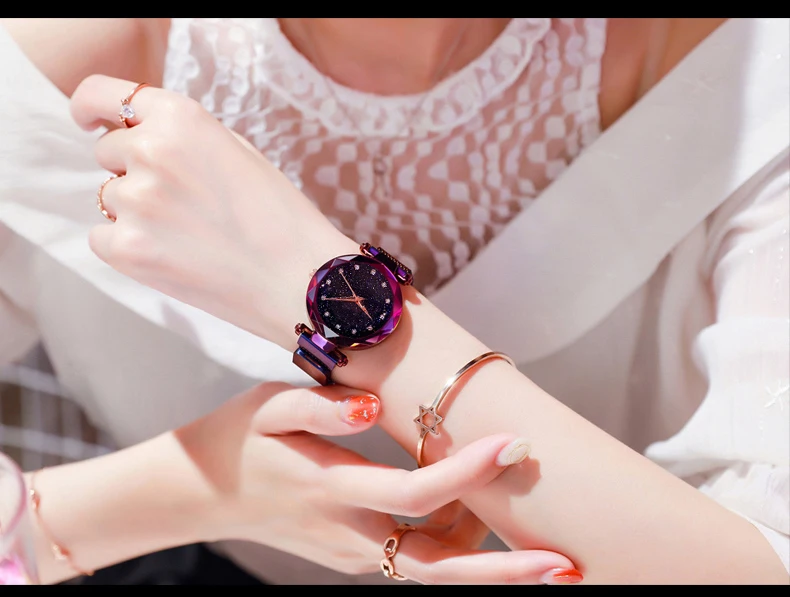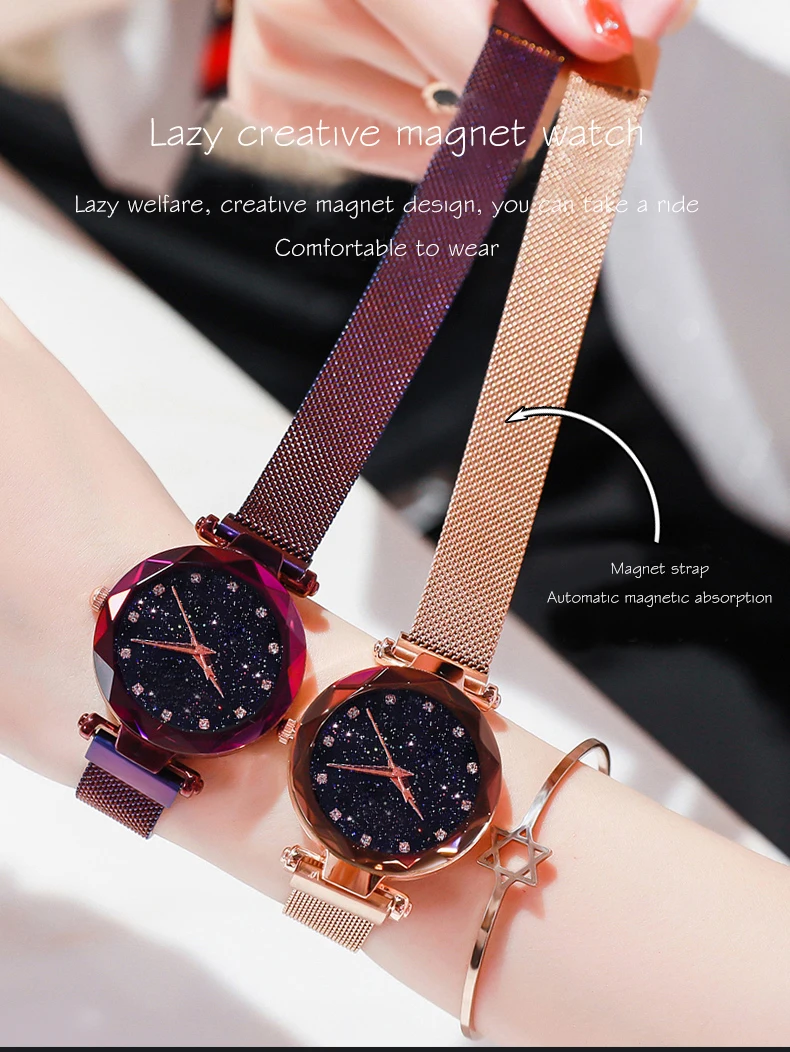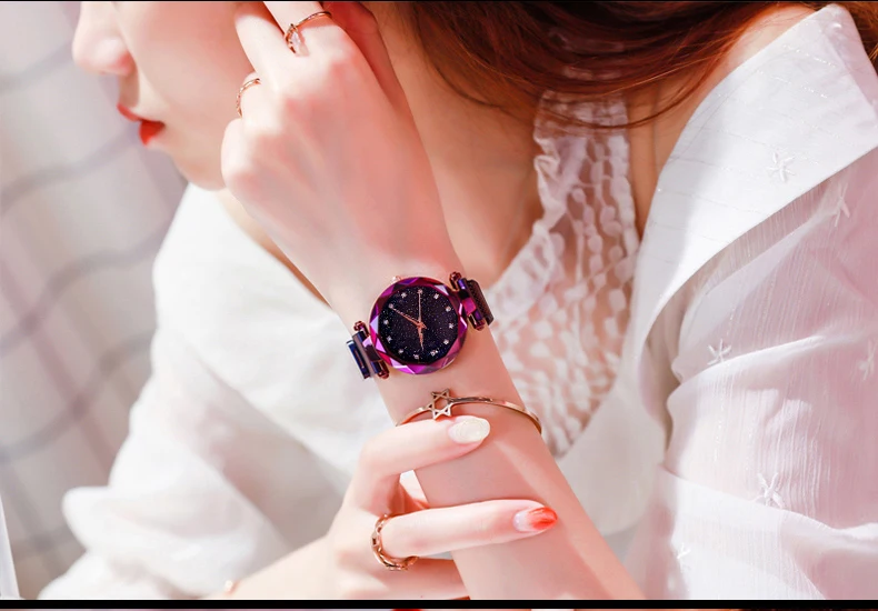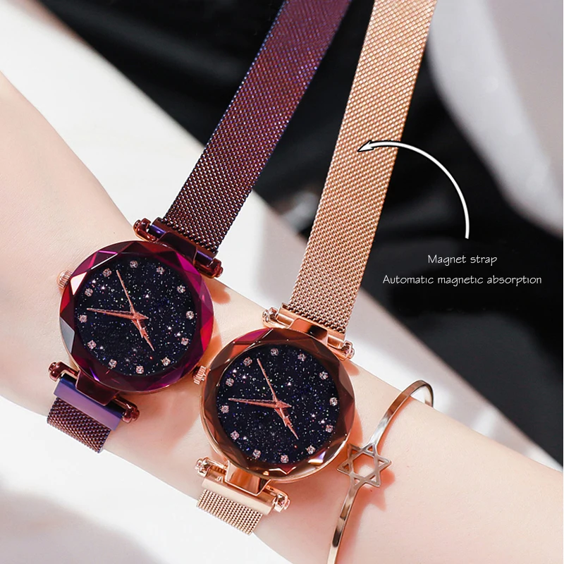 Часы женские кварцевые с магнитной застежкой, роскошные модные наручные, с сетчатым браслетом, с изображением звездного неба